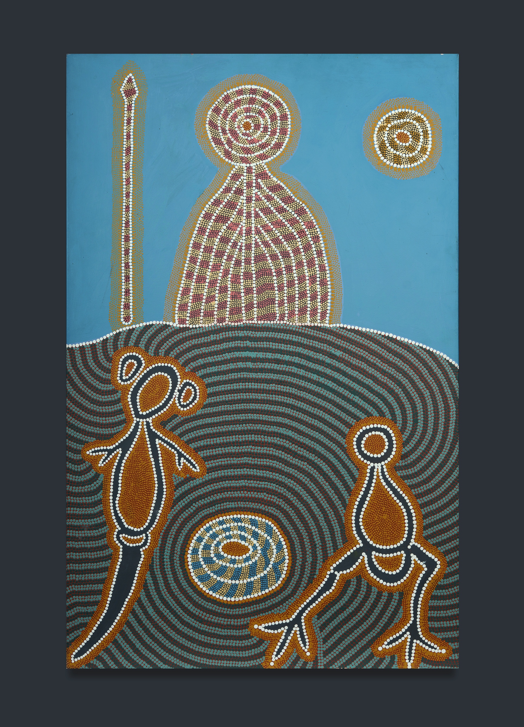 NAPALTJARRI, Linda Syddick (Aboriginal b.1941) 'Rain Maker,' 1995. Acrylic on Canvas 90x57.5cm PROVENANCE: Gallery Gondwana, Alice Springs, NT, cat #1865 (stamp verso, plus certificate of authenticity included)Estimate $1,000-2,000