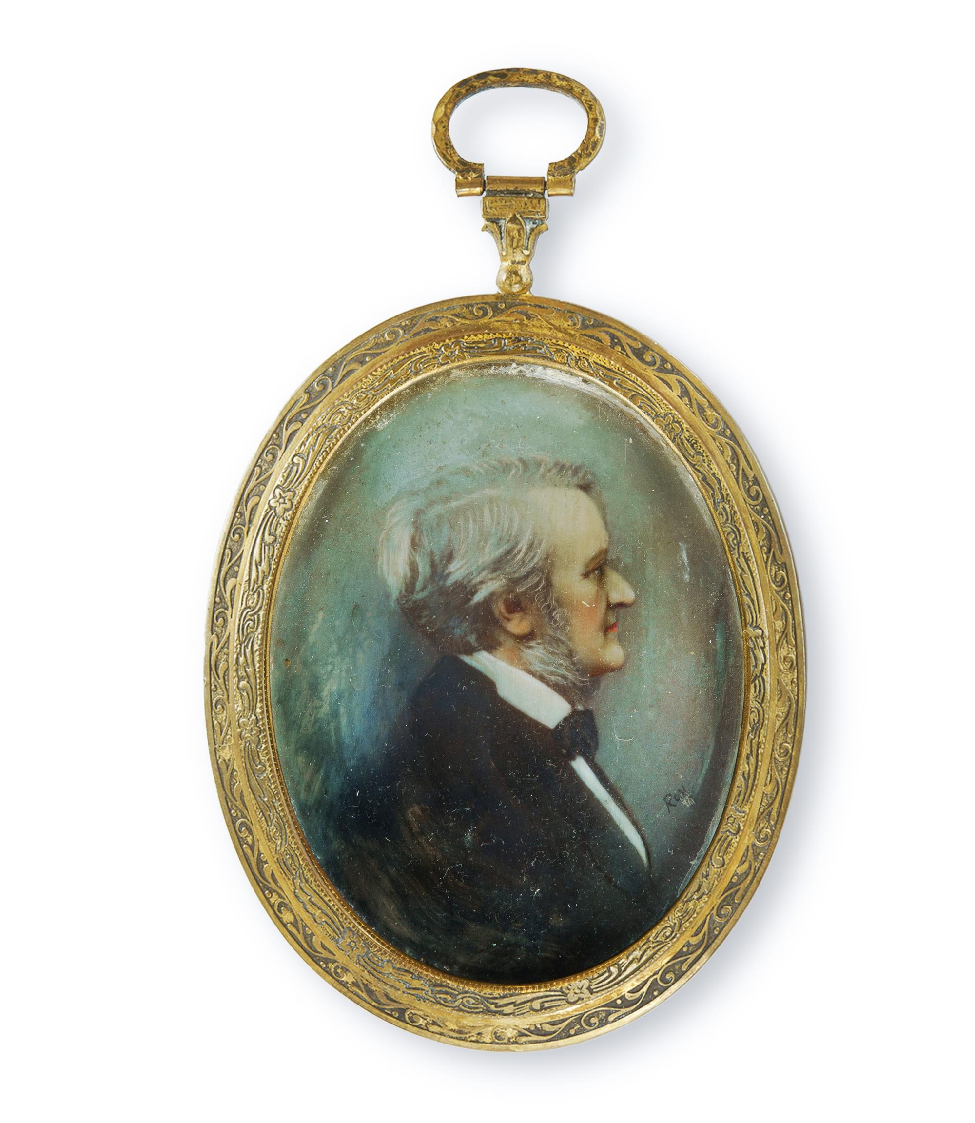 3 Miniature Portraits of Composers Depicting Wagner, Schubert and Beethoven. Each hand-painted on oval ivory panels, 2 signed 'Roy'. Set in gilt brass frames. NB: ivory export restrictions. (13x8cm frame)Estimate $300-500