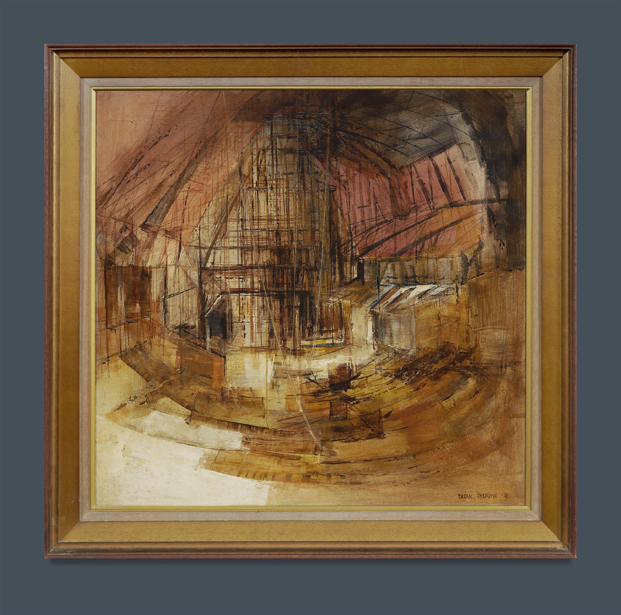 SHERIDAN, Susan (b.1939) 'The Opera House,' 1970. Signed and dated lower right. Lennox Gallery, Sydney, label verso. Oil on Board 57.5x60cm (image) 71x73cm (frame)Estimate $100-200