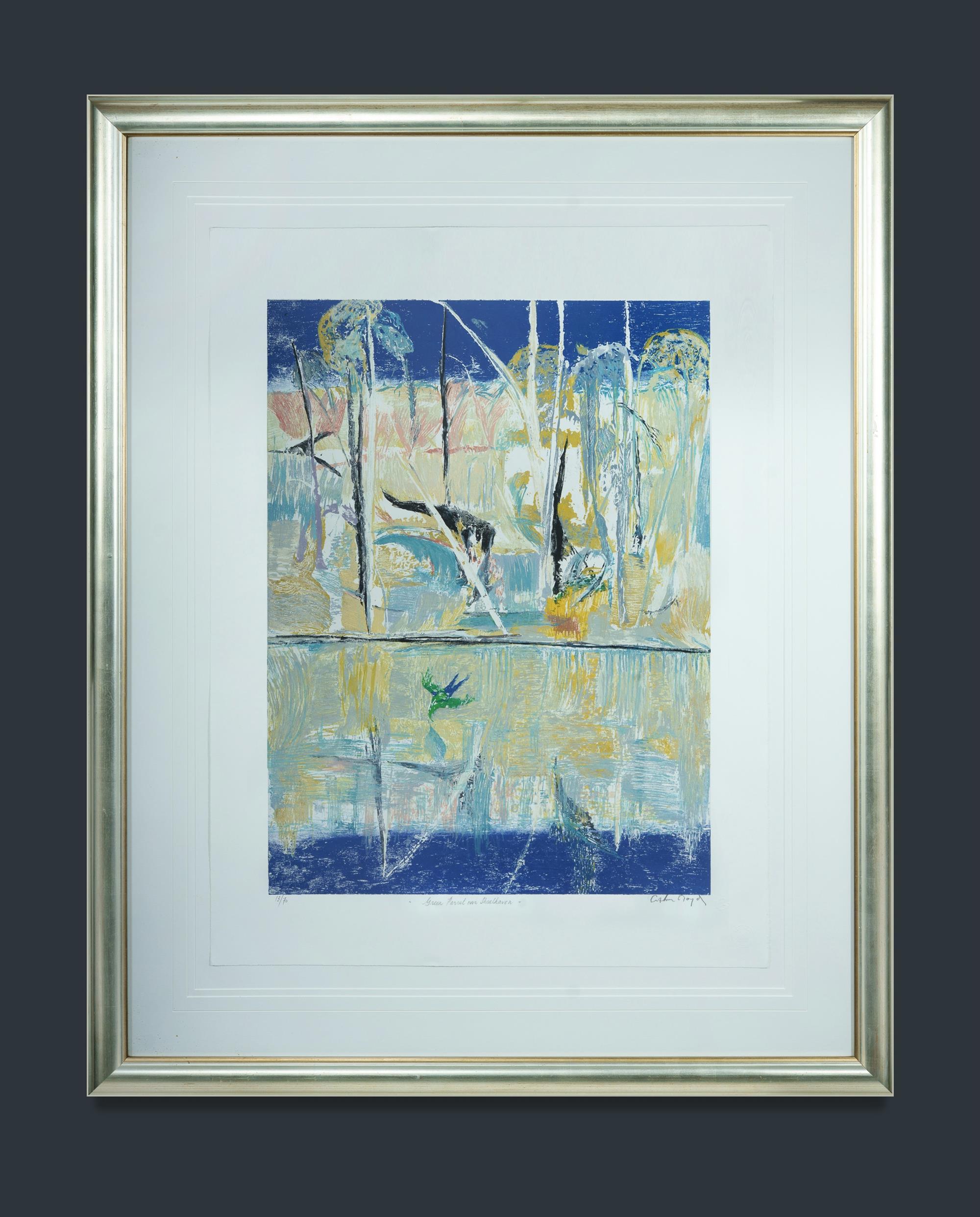 BOYD, Arthur Merric Bloomfield (1920-1999) 'Green Parrot Over Shoalhaven' Signed lower right. Colour Lithograph 13/70 80.5x60cm (image) 100x76cm (sheet) 137x111cm (frame)Estimate $800-1,500
