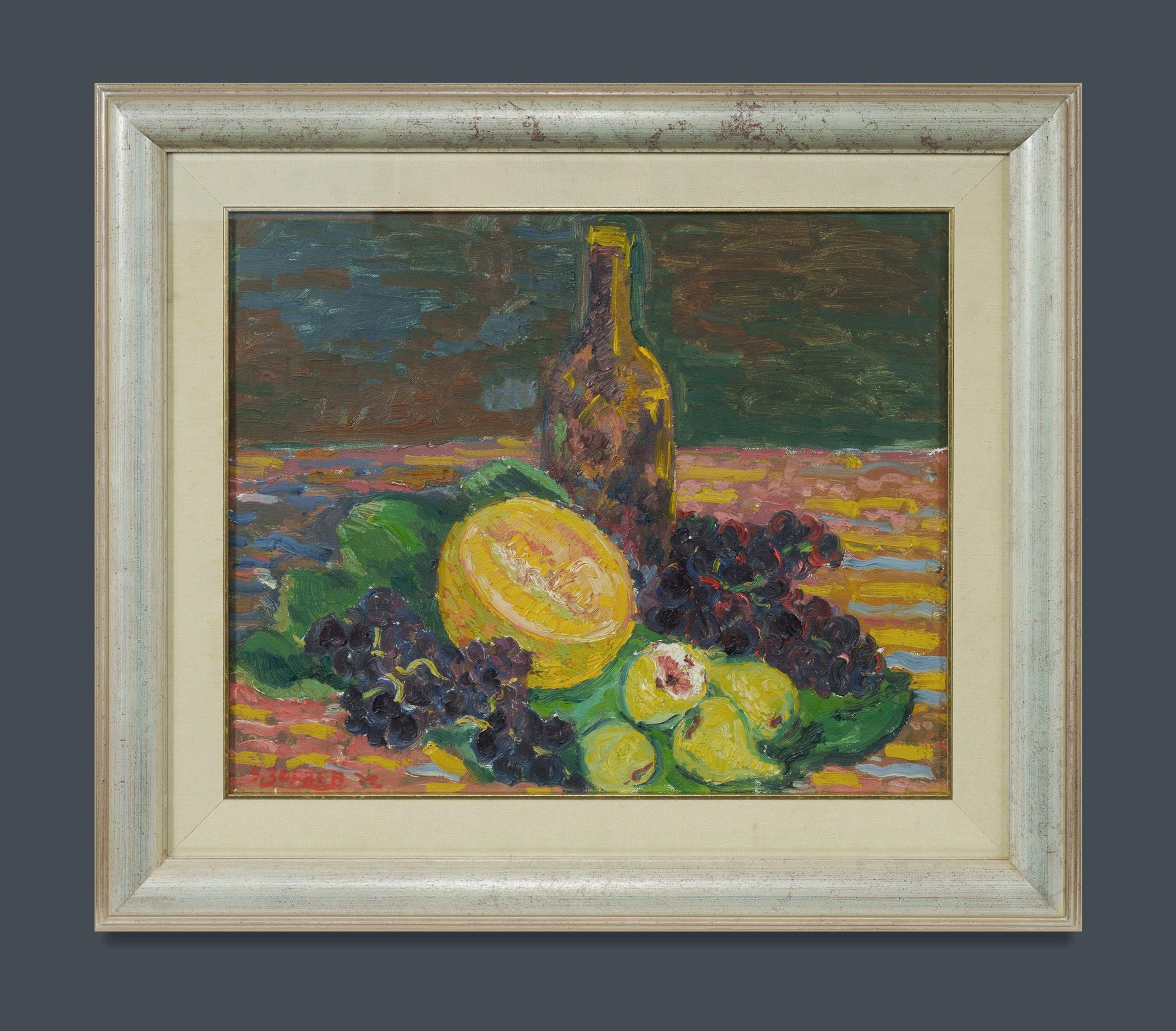 ZOFREA, Salvatore (b.1946) Still Life with Bottle and Fruit, 1972. Signed and dated lower left. Oil on Board 44.5x54.5cm PROVENANCE: Ken Hinds Cultural Heritage Collection, Qld.Estimate $300-500