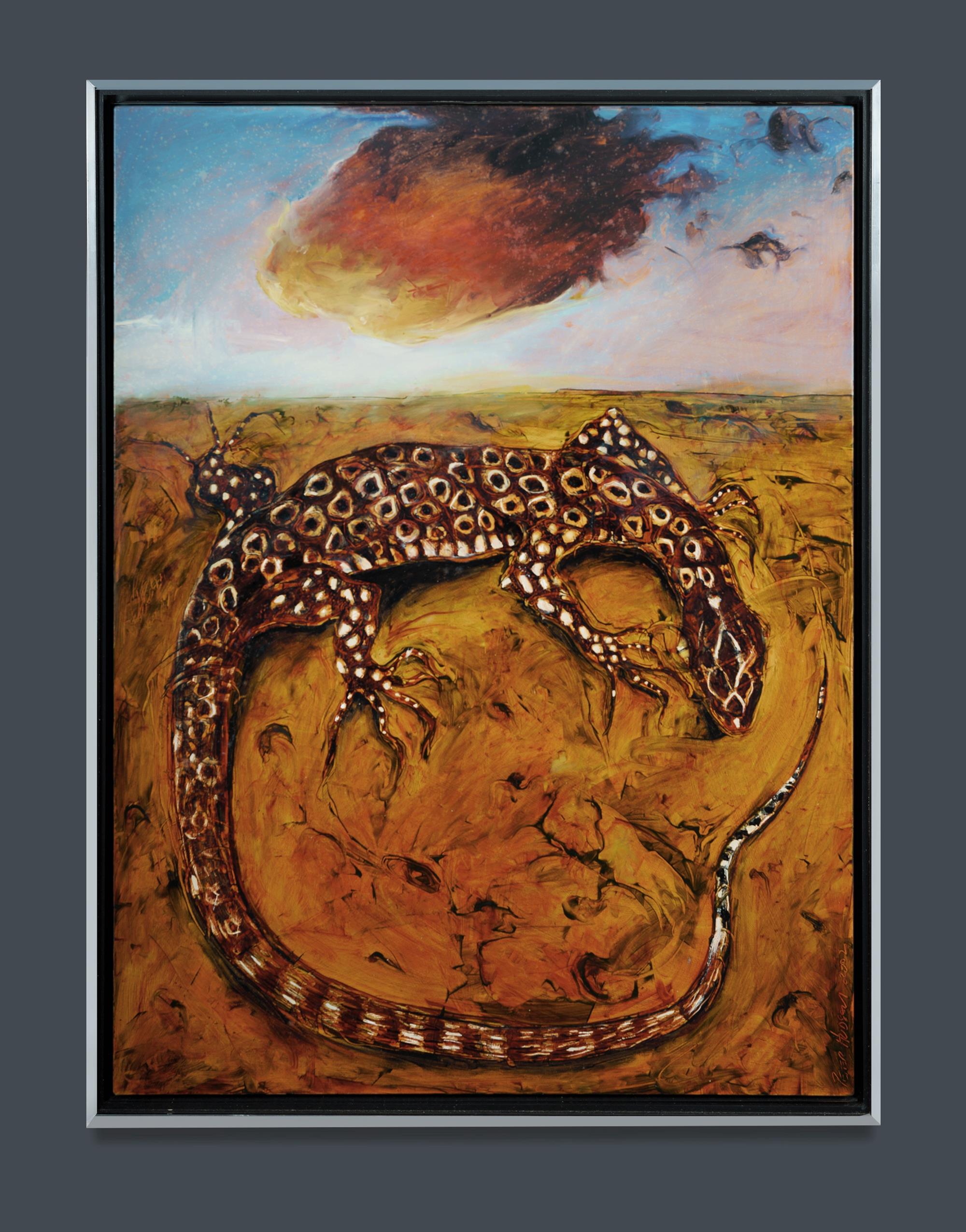 HUDSON, Peter (b.1950) Lizard in Outback, 2002. Signed lower right Oil on Board 122x91cm PROVENANCE: Ken Hinds Cultural Heritage Collection, Qld.Estimate $300-500