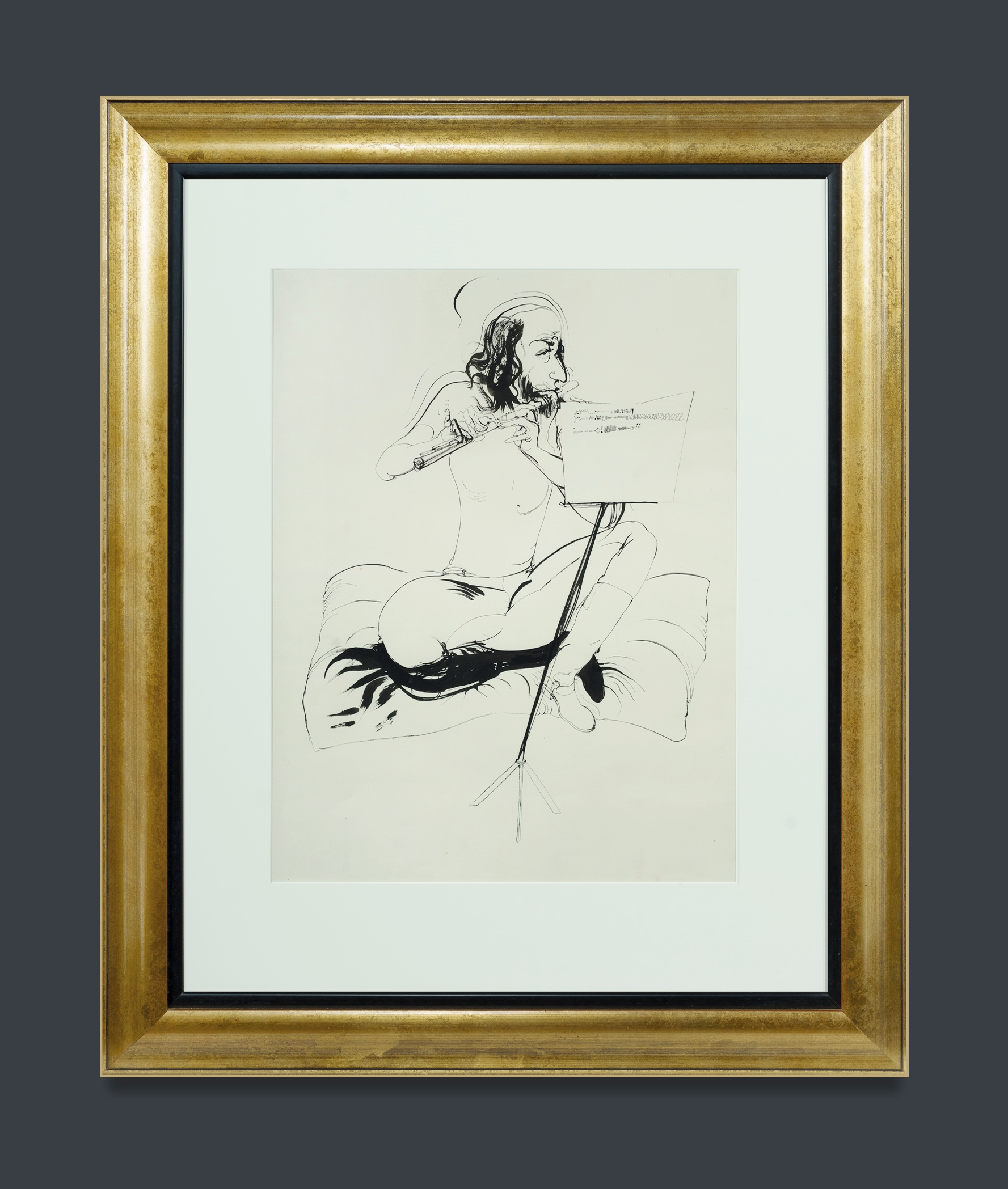 WHITELEY, Brett (1939-1992) 'Joel Elenberg Playing the Flute,' c.1975/6. Unsigned Ink on Paper with Collage 65x49cm (sight) 66x50cm (sheet) PROVENANCE: Christie's, Melbourne, November 25th 1997 (lot 201); Ken Hinds Cultural Heritage Collection, Qld. EXHIBITIONS: Caloundra Regional Art Gallery, 'Privately Collecting, Ken Hinds Cultural Heritage Collection,' Feb - Mar 2006 (catalogue included) LITERATURE: Sutherland, K., Brett Whiteley: Catalogue Raisonné, Schwartz Publishing, Melbourne, 2020, vol.7, p.320 (referenced in cat. 27.75) OTHER NOTES: © Wendy Whiteley/Copyright Agency, 2025.Estimate $45,000-65,000