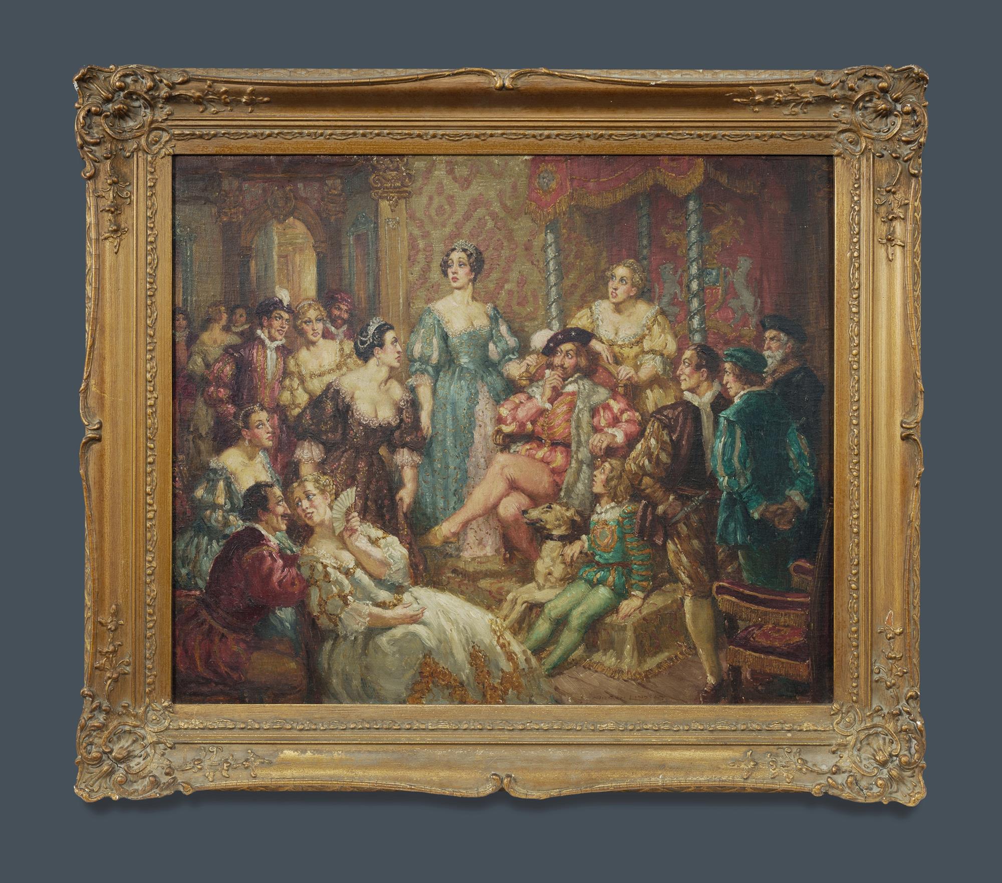 LINDSAY, Norman (1879-1969) 'Too Many Ladies' Signed lower right. Remnants of old label verso. Oil on Canvas on Board 49.5x60cm PROVENANCE: By descent, private family collection, Sydney.Estimate $30,000-50,000