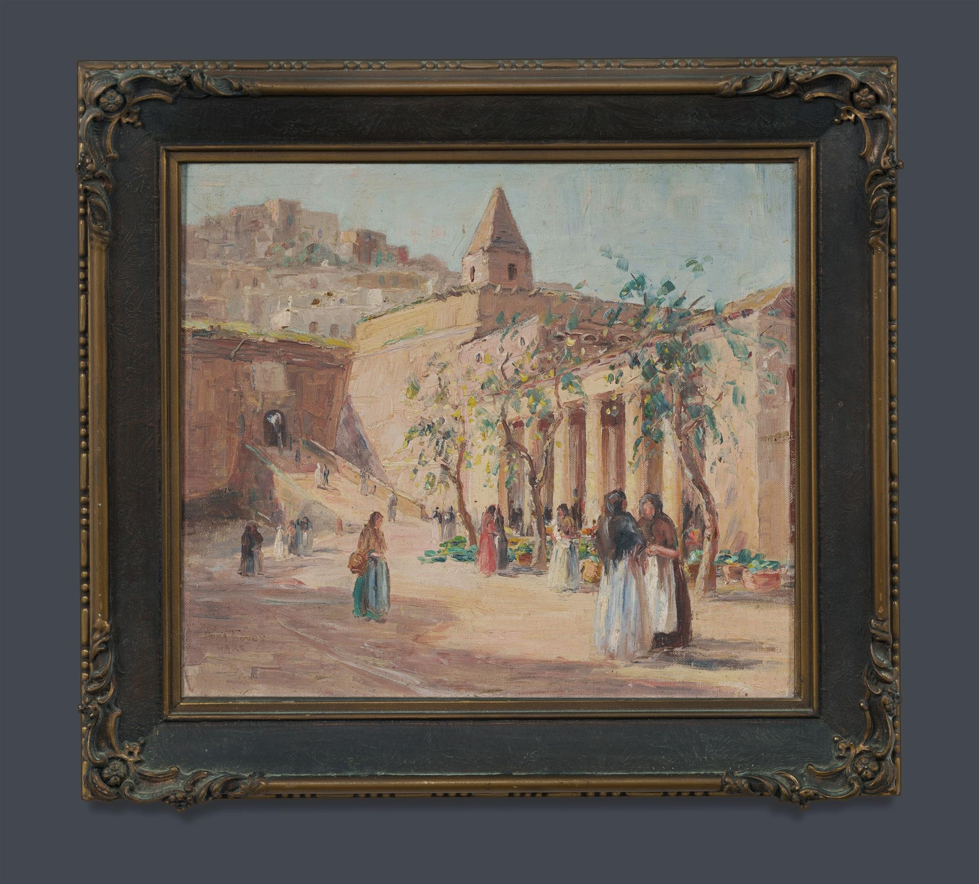 TOOVEY, Dora (1898-1986) 'Spanish Market, Ibiza,' 1928. Signed and dated lower left. Old picture framer (S.A. Parker) labels verso. Oil on Canvas on Board 34x39cmEstimate $300-500