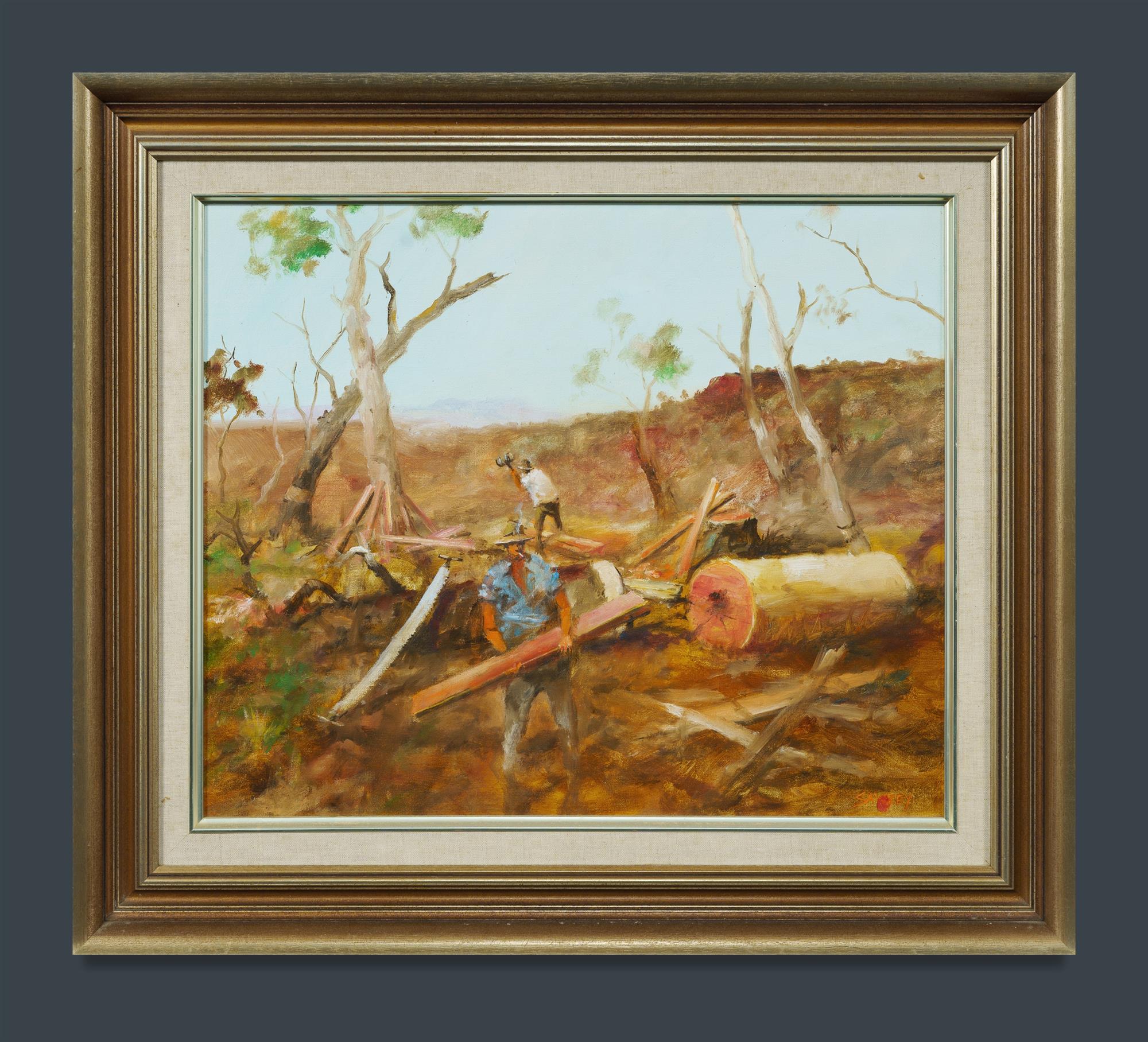 SAWREY, Hugh (1919-1999) 'The Post Splitters' Signed lower right and verso. Oil on Canvas on Board 49x59.5cmEstimate $4,000-6,000