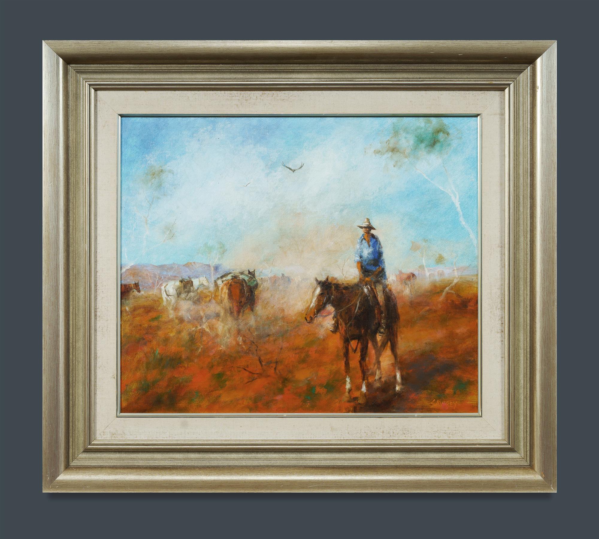 SAWREY, Hugh (1919-1999) 'Heading for the Muster - Mooraberrie Station, Channel Country, S.W. QLD' Signed lower right. Ex Schubert Gallery, Surfers Paradise (label verso) Oil on Canvas on Board 50x60cmEstimate $5,000-8,000