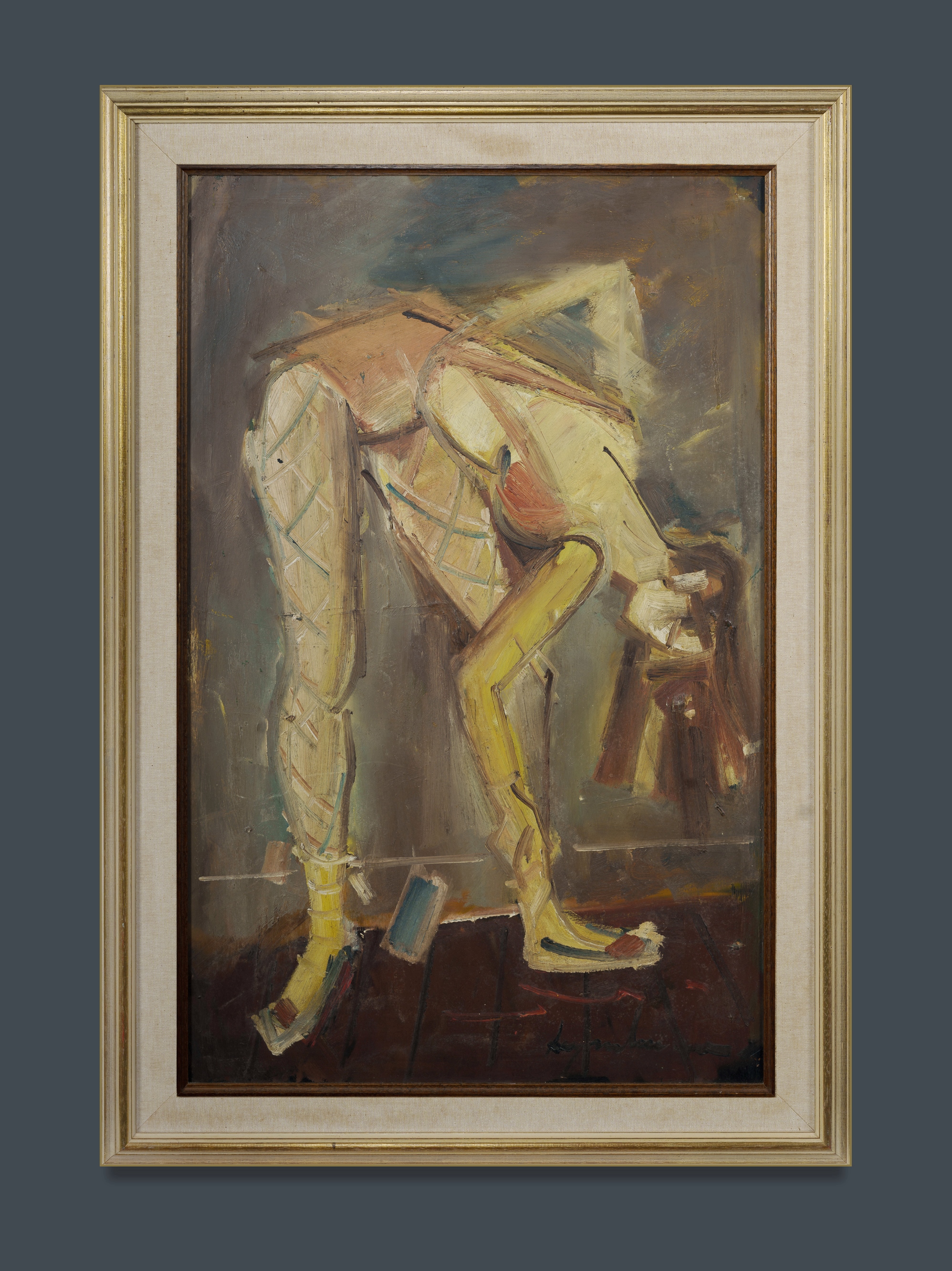 LYMBURNER, Francis (1916-1972) 'Limbering Up / Ballet Stretching,' c.1964. Signed lower right. Old exhibition label verso (cat #4) Oil on Board 84.5x53.5cmEstimate $1,800-2,500