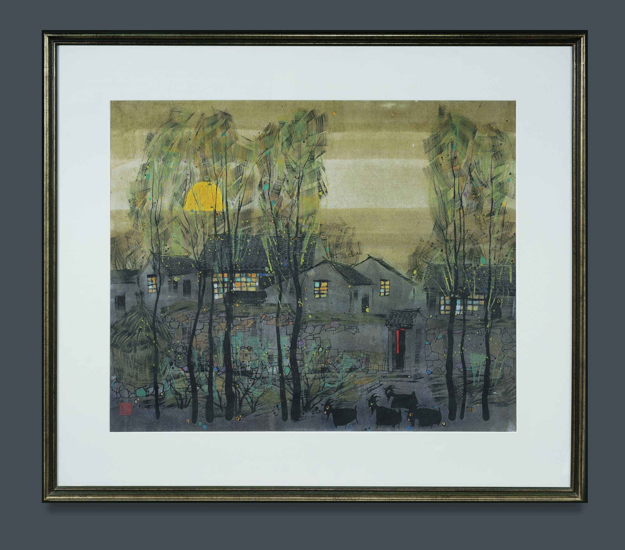 LI, Fuyuan (Chinese b.1942) Village with Goats at Night, 1993. Signed, dated and with artist's seal lower left. Ink & Colour on Paper 62x76cm (sight) PROVENANCE: Sin Hua Gallery, Singapore, 1998 (copy of purchase receipt available); private family collection, Singapore thence Sydney.Estimate $600-1,000