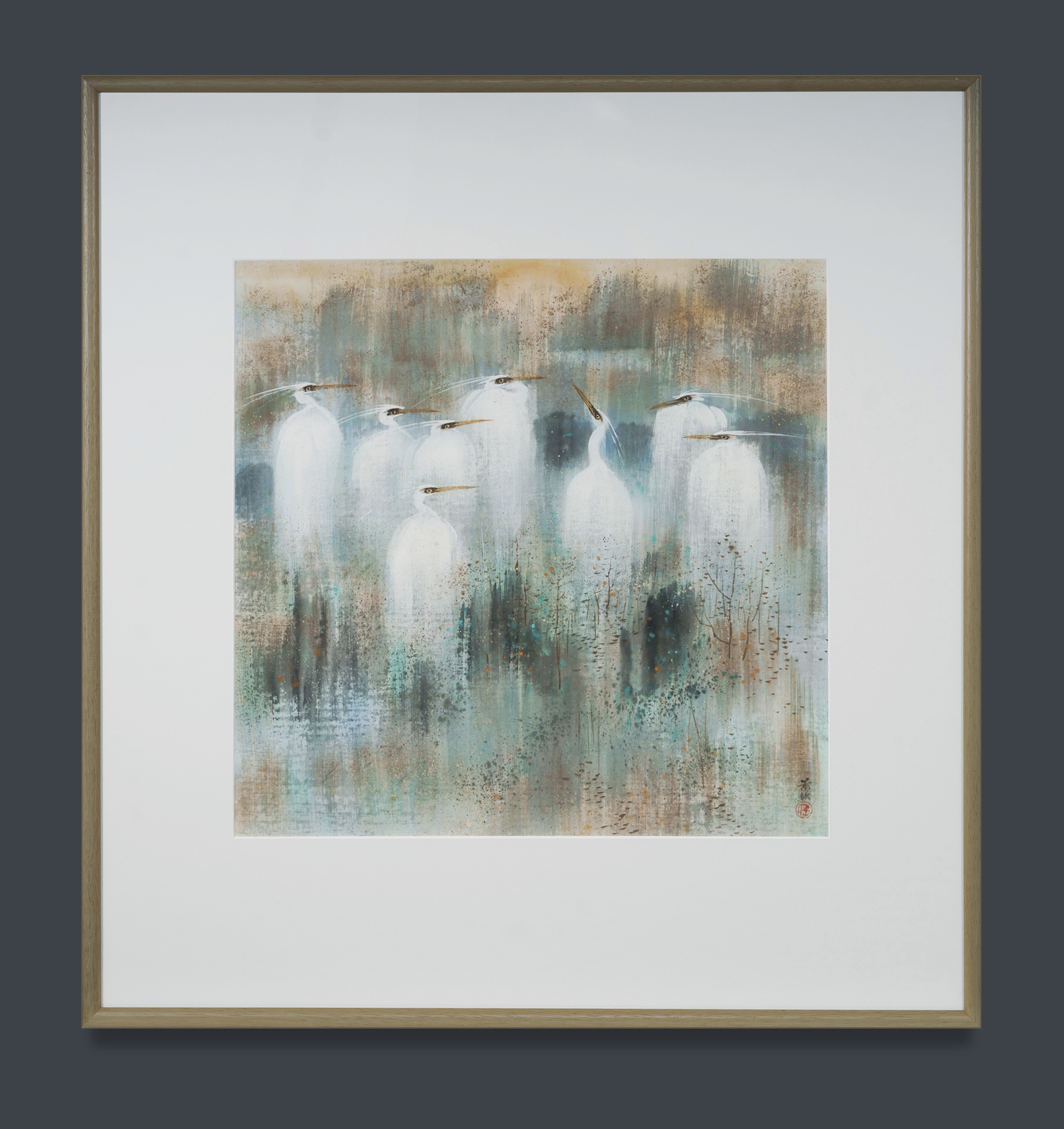 REN, Jingqin (Chinese b.1942) 'Cranes' Signed with artist's seal lower right. Ink & Colour on Paper 61x62cm (sight) PROVENANCE: Sin Hua Gallery, Singapore, 1991 (copy of purchase receipt available); private family collection, Singapore thence Sydney.Estimate $800-1,500