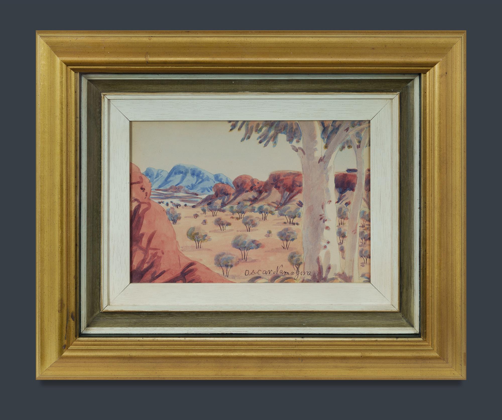 NAMATJIRA, Oscar (1922-1991) Central Australian Landscape Signed lower centre. W/Clr 17.5x26cm PROVENANCE: Lawson-Menzies, May 24th 2001 (lot 72); Ken Hinds Cultural Heritage Collection, Qld.Estimate $250-450