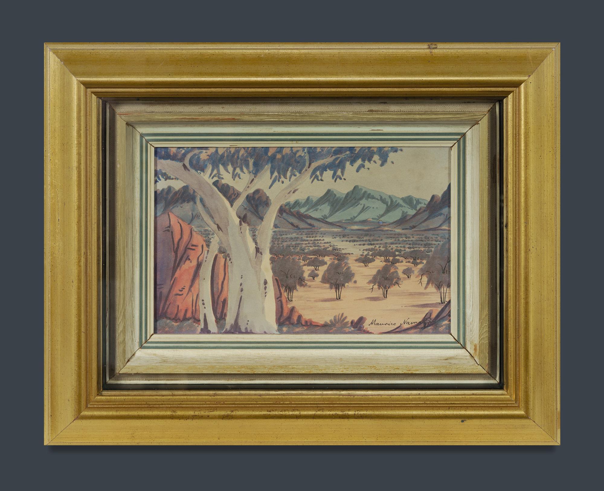 NAMATJIRA, Maurice (1938-1977) Ghost Gum and Mountain Range Signed lower right. W/Clr 15x24cm PROVENANCE: Ken Hinds Cultural Heritage Collection, Qld.Estimate $250-350