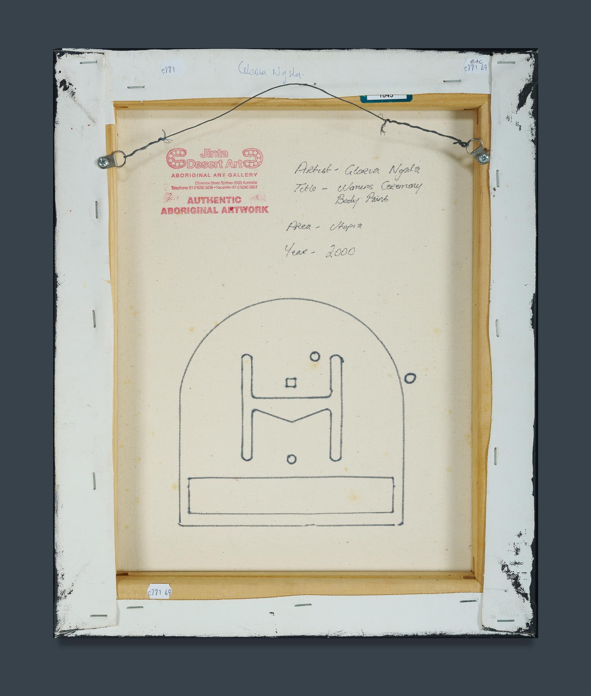 NGALA, Gloria (Aboriginal School) 'Womens Ceremony Body Paint,' 2000. Acrylic on Canvas 43x35cm PROVENANCE: Jinta Desert Art (stamped verso); Ken Hinds Cultural Heritage Collection, Qld.Estimate $150-300