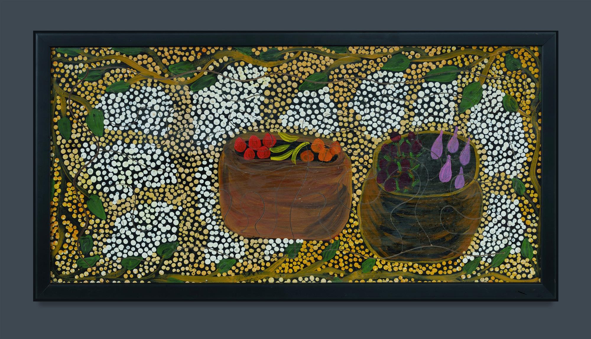 DONEGAN, Melissa (Aboriginal b.1969) 'Two wirras full of bush fruits' Inscribed verso. Acrylic on Craft Board 29x59cm PROVENANCE: Blackstone Women's Centre, Alice Springs - Blackstone Jigsaws (label verso); Ken Hinds Cultural Heritage Collection, Qld.Estimate $100-200