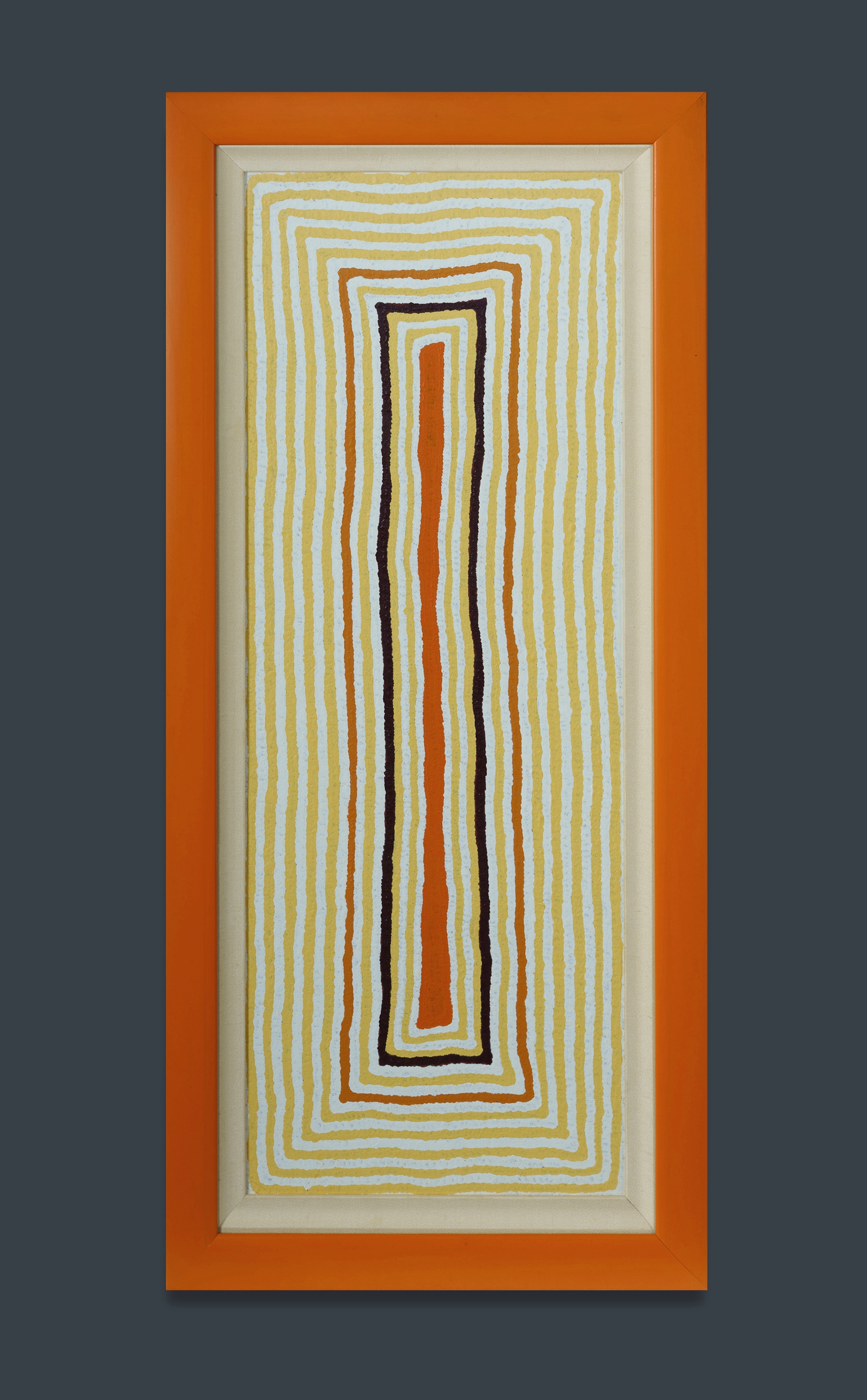 TJAMPITJIN, Sam Willikati (Aboriginal c.1930-2004) Wilkinkarra, 2000. Acrylic on Linen 78.5x29cm (sight) PROVENANCE: Warlayirti Artists, cat #878/00; Lawson-Menzies, May 25th 2004 (lot 15); Ken Hinds Cultural Heritage Collection, Qld. Estimate $800-1,500