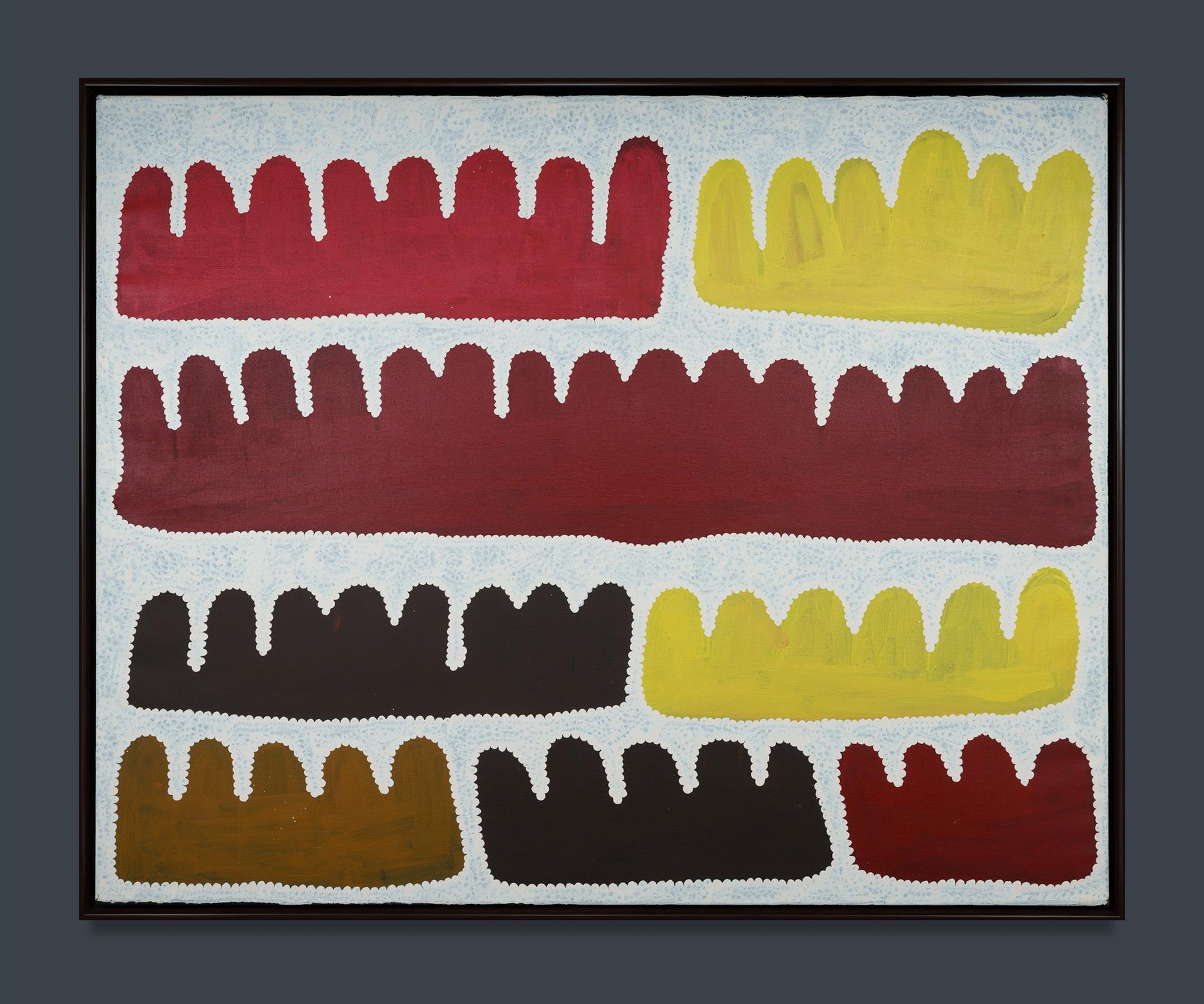TJAPANANGKA, Long Tom (Aboriginal c.1929-2006) 'Puli Tjuta (Many Hills)' 2000. Signed and inscribed verso. Catalogue details not visible (likely obscured by framing) Acrylic on Linen 153x123cm PROVENANCE: Ken Hinds Cultural Heritage Collection, Qld.Estimate $2,000-4,000