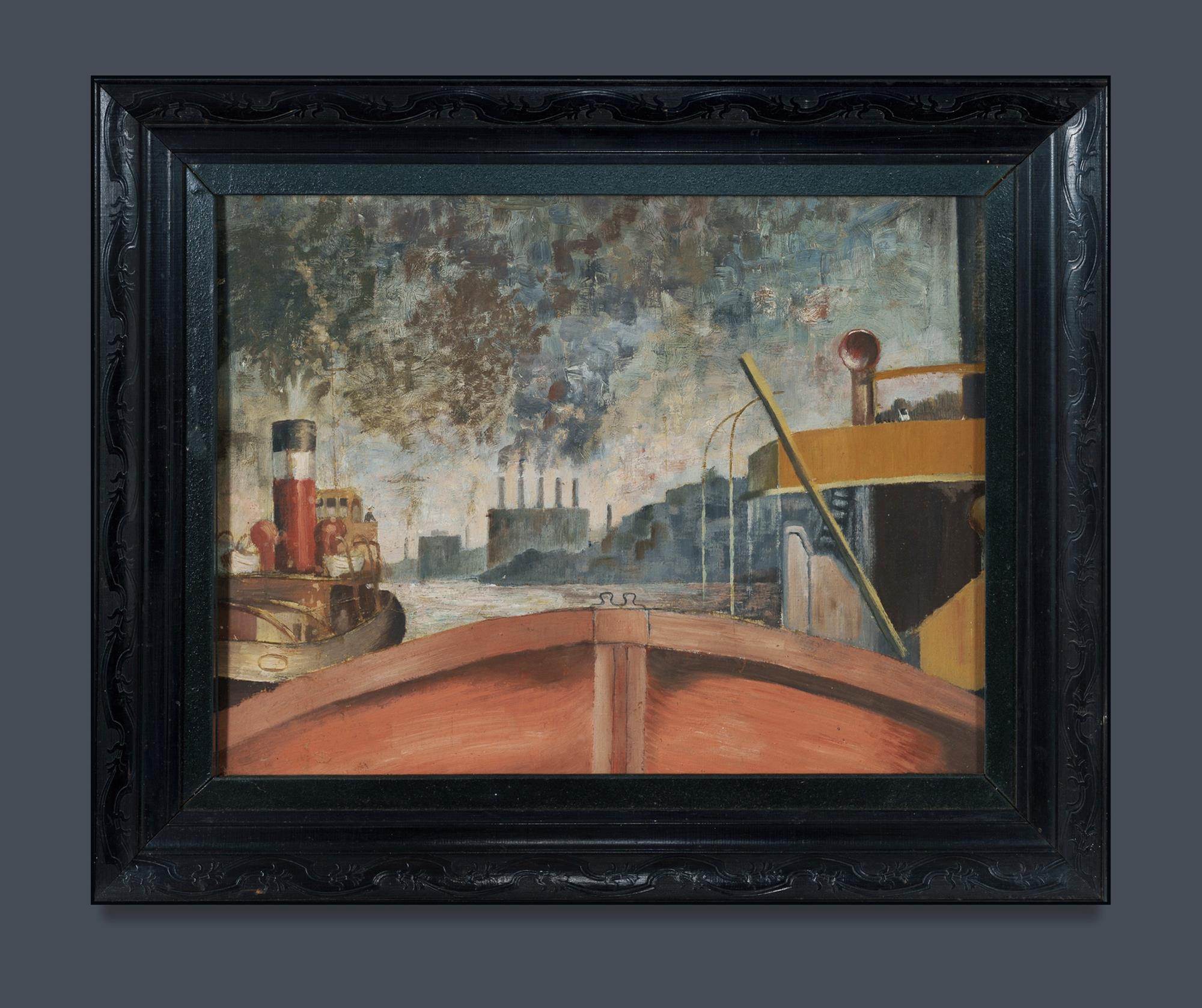 Australian School, Artist Unknown Sydney Steam Tug and Power Station, c.1947. Unsigned. Page from the Sydney newspaper, 'Sunday Sun and Guardian,' June 15th 1947, affixed verso. Subject possibly White Bay Power Station from Blackwattle Bay, steam tug reminiscent of 'Wattle' (see photograph), with an old Sydney ferry at left of scene (nb the Lady Northcote serviced the inner harbour Balmain from the 1900s until the mid 1940s) Oil on Board 40x53cm