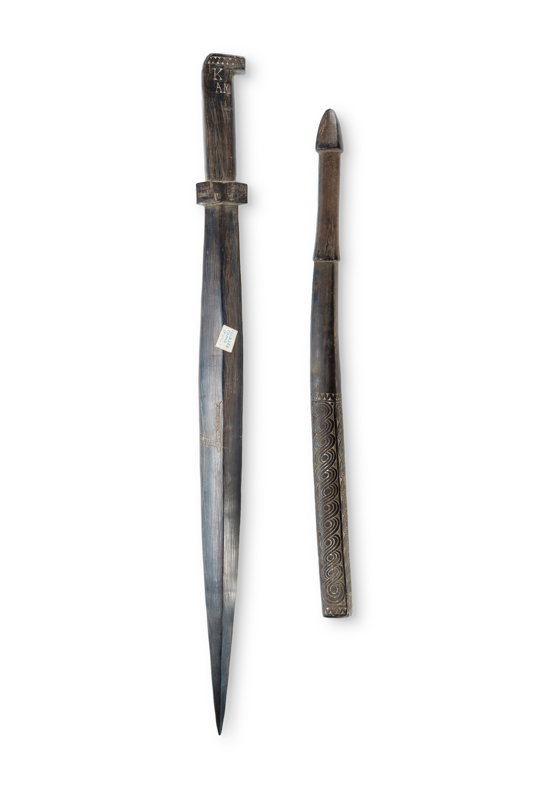Two Trobriand Island Artefacts Including ebony club of square section (L53cm); and an ebony 'sword' club bearing a Sir Edward Ford Collection label 'Woodlark Island (Murua)', and incised with initials 'K.A.M.' (L73cm)