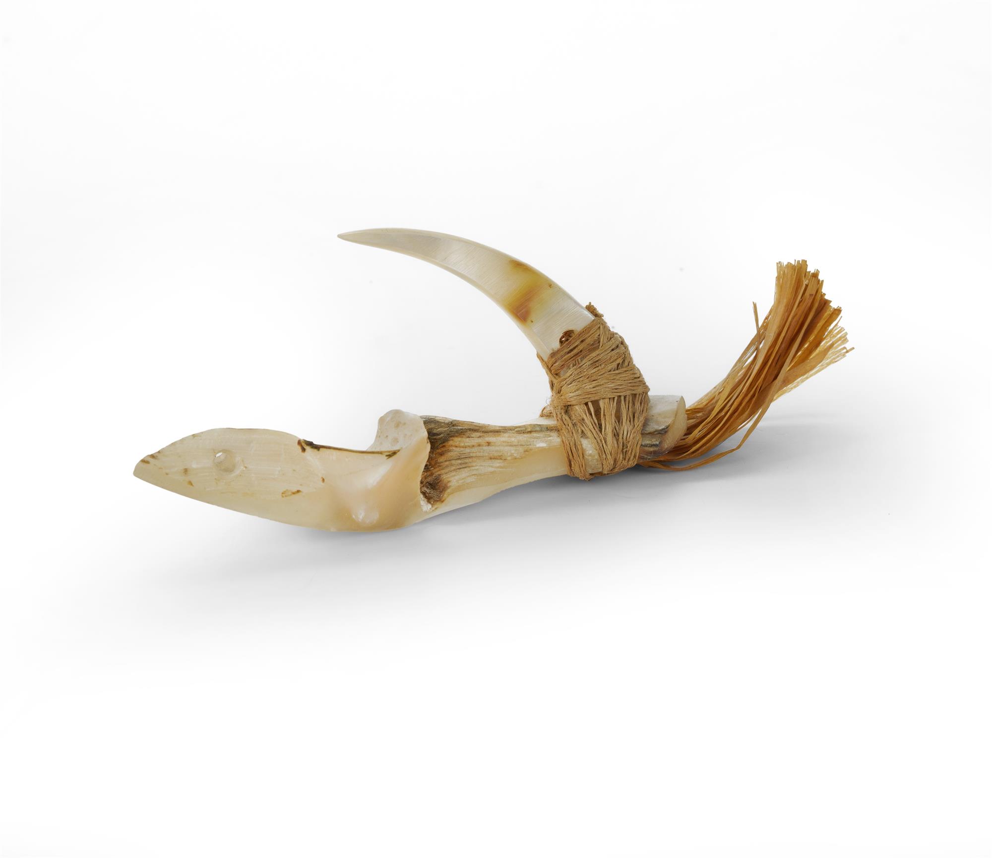 19th C Marshall Islands MoP Fish Hook With a card collection label from Tost & Rohu, 'Fishing hook made from MoP shell used by natives for catching barracuda, dolphin and bonito fish, Namerak and Ebon Marshall Islands'. (L14cm)