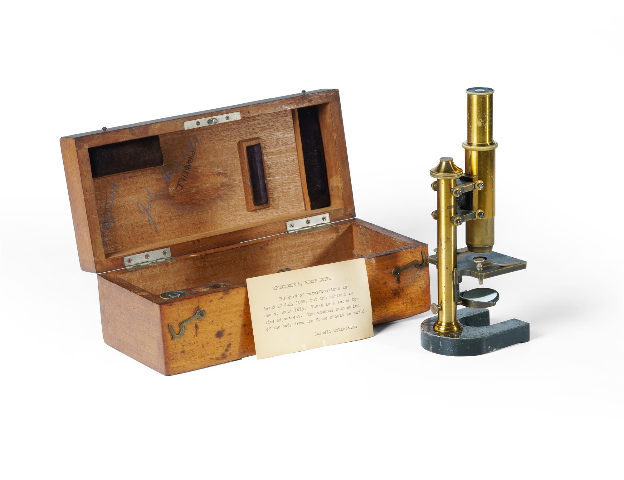 19th C Ernst Leitz Microscope, c.1875. In a fitted mahogany case with 2 eye pieces. Factory production No.14722. 29x18x11cm (case) PROVENANCE: Collection Late Kenneth F. Russell (1911-1987), Professor of Anatomy and Medical History, University of Melbourne.Estimate $100-200