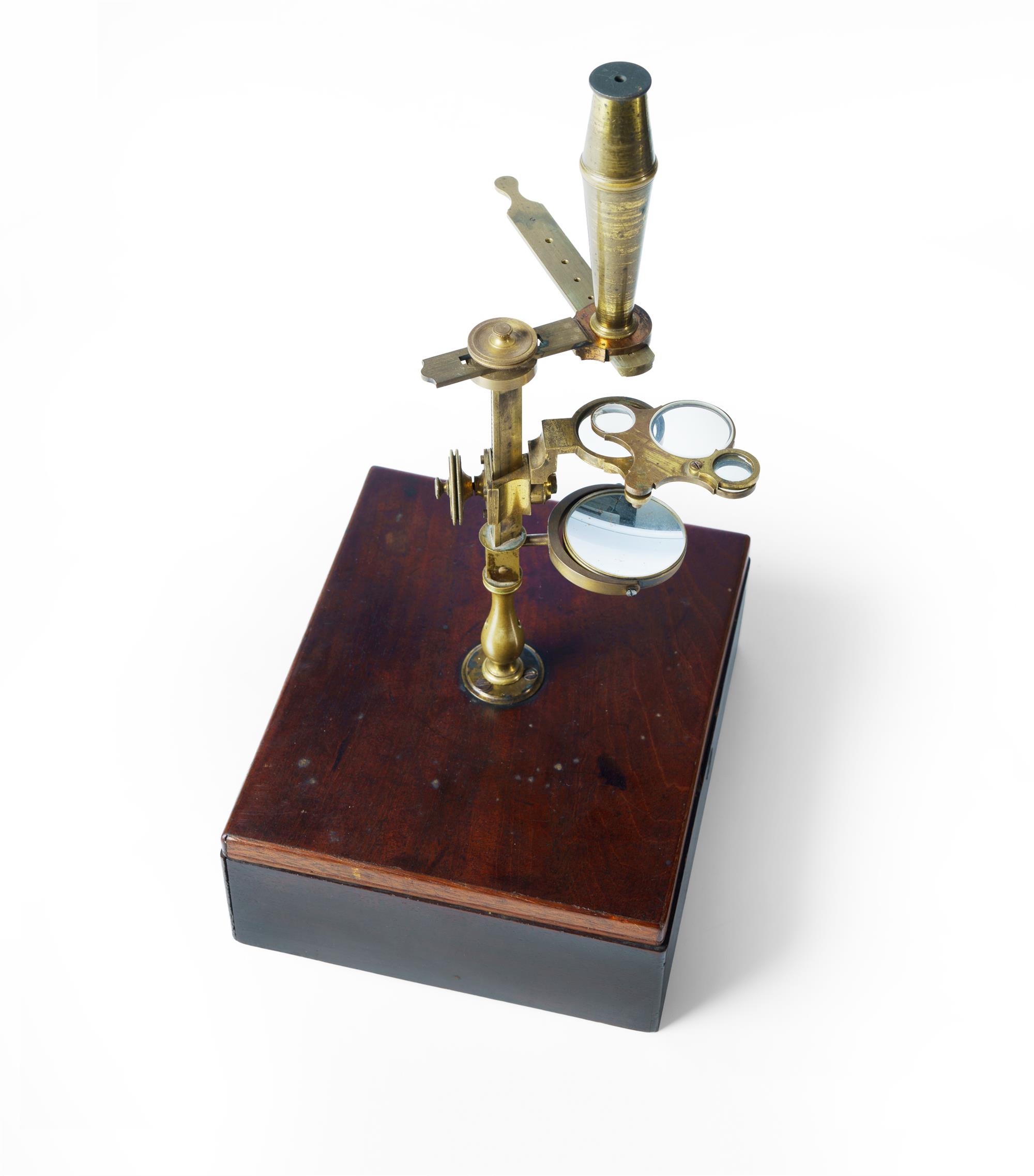 Early 19th C Cary-Gould Portable Microscope With mahogany travel case. 18x15x6.5cm (case) PROVENANCE: Collection Late Kenneth F. Russell (1911-1987), Professor of Anatomy and Medical History, University of Melbourne.Estimate $200-400