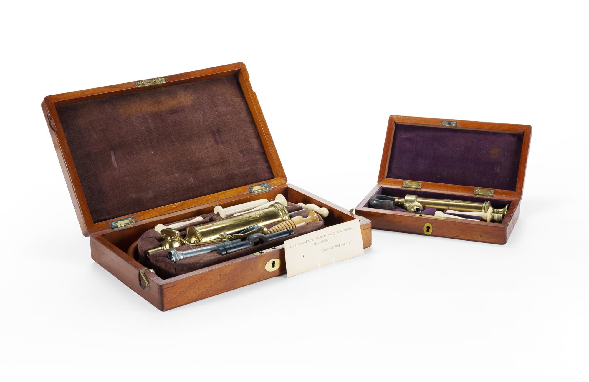 2 19th C Enema and Stomach Pumps Each in a fitted velvet-lined mahogany case. Brass pumps with trade plaques for S. Maw & Son (1860-1870) and 'S. Maw, Son & Thompson (1870-1918). With ivory accessories. NB: ivory export restrictions. 30x18x6cm (largest case)