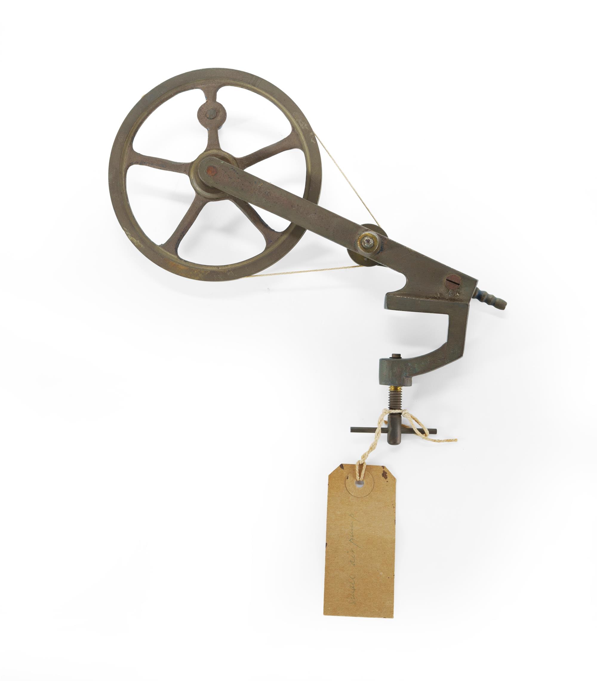 Hand Driven Air Pump Brass with table clamp. (L25cm) PROVENANCE: Collection Late Kenneth F. Russell (1911-1987), Professor of Anatomy and Medical History, University of Melbourne.Estimate $100-200