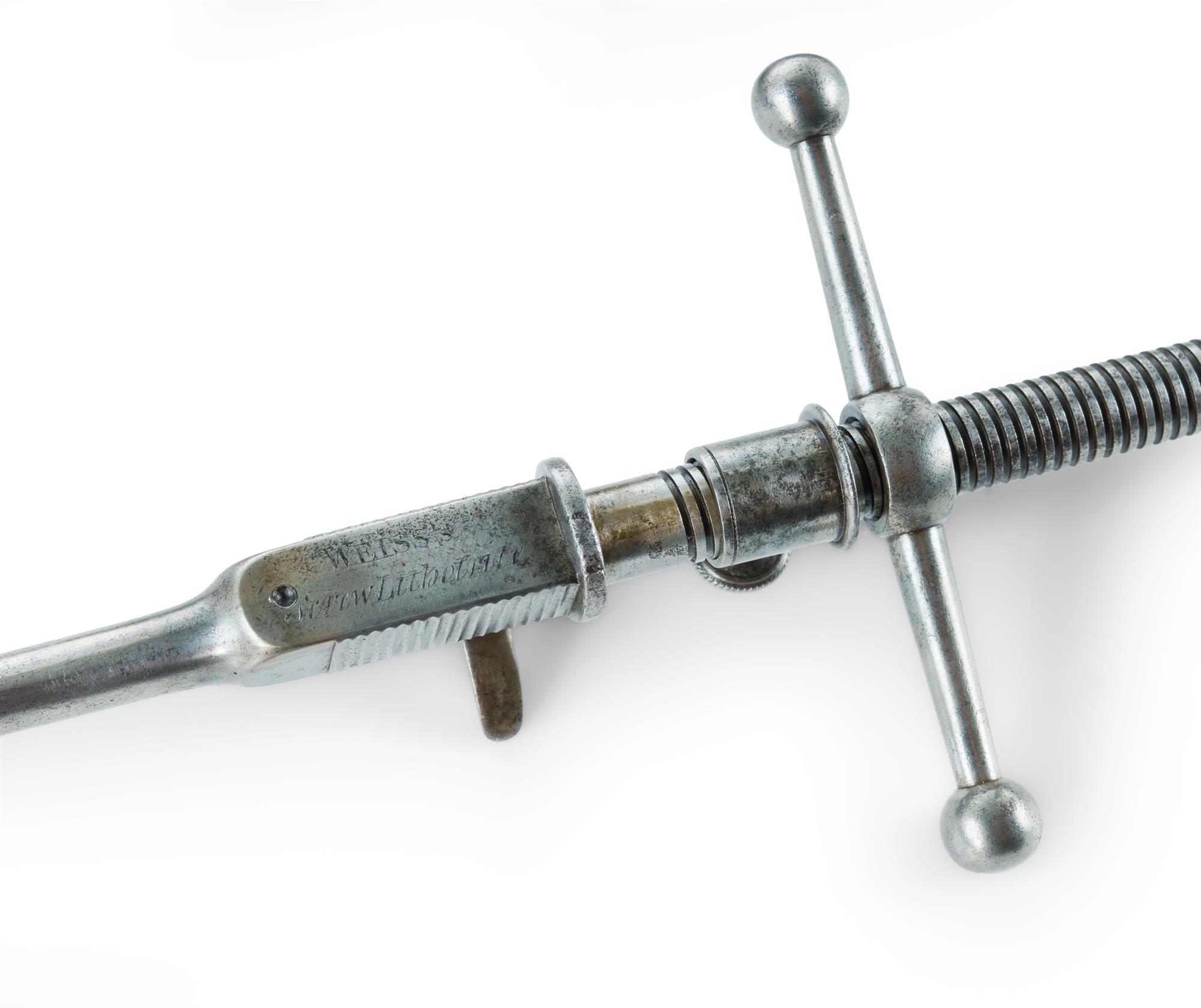 Group of 19th C Lithotomy Instruments Including 2 screw lithotrites, cased lithotomy catheters. Various makers. PROVENANCE: Collection Late Kenneth F. Russell (1911-1987), Professor of Anatomy and Medical History, University of Melbourne.Estimate $150-300
