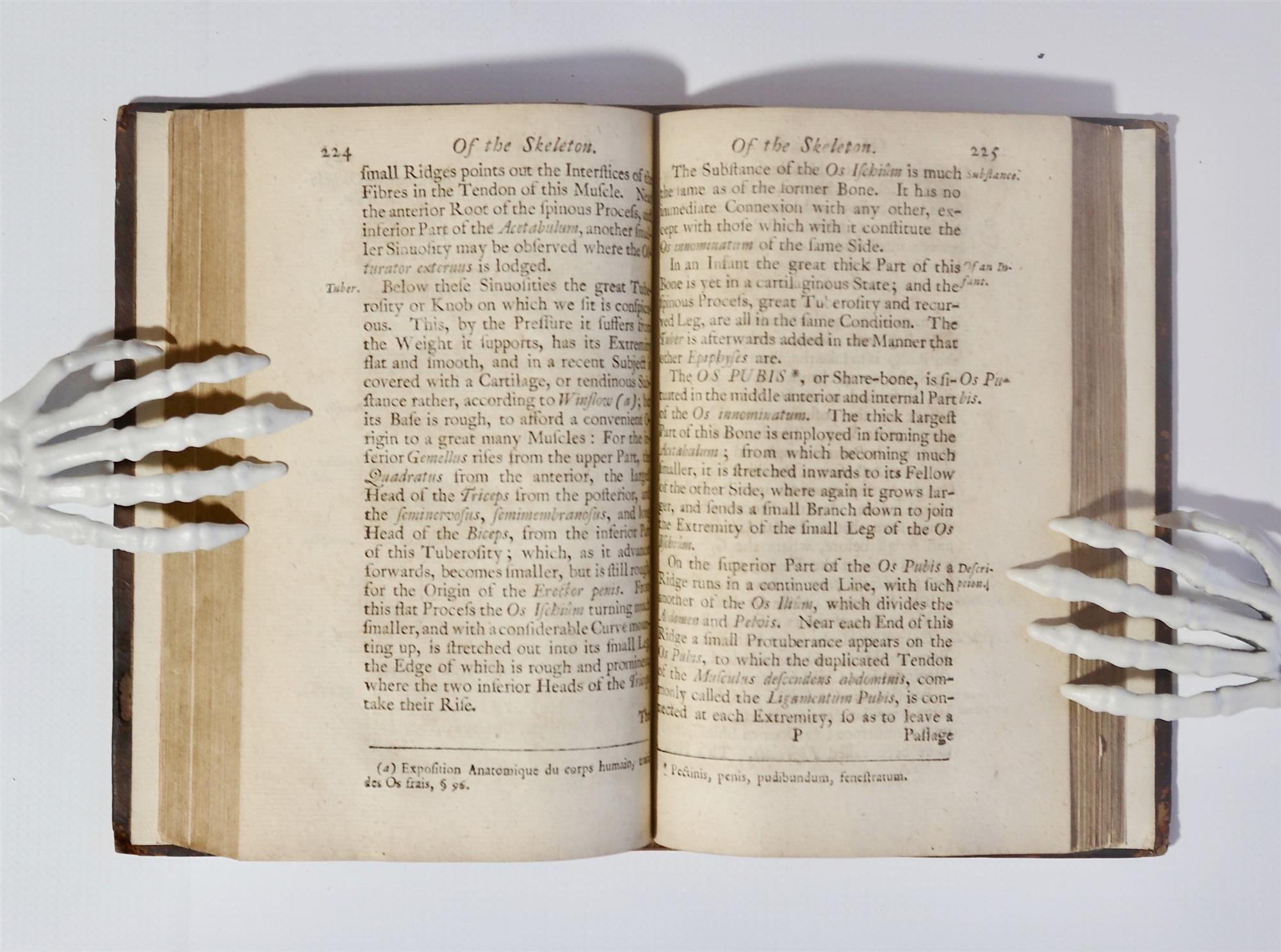 MONRO, Alexander (Primus) (1697-1767) The Anatomy of the Humane Bones To which are added, an anatomical treatise of the nerves; an account of the reciprocal motions of the heart; and a description of the humane lacteal sac and duct. Pub. EDINGURGH: Printed by T. & W. Ruddiman, for Mr. William Munro, Bookseller. Sold at his shop, and by most booksellers in Edinburgh; and at London by J. Osborn and T. Longman at the Ship in Pater-noster-row. MDCCXXXII [1732]. Second edition, corrected and enlarged. pp. [2] iii-viii 1-344 [2] iii-iv 1-41 [3]. The 'Anatomical treatise of the nerves' after p.344 has its own title page and pagination but continuous register. Alexander Munro, primus was professor of Anatomy in Edinburgh as well as his son and grandson, both also Alexander. Monro, primus and secundus were responsible for establishing the greatness of the Edinburgh Medical School in the 18th century, attracting students from all parts of the world. The anatomy of the bones first printed in 1726 went through 19 editions and was translated into French. Rebound retaining original leather covered boards, spine replaced. Darkened title page, toned text though overall clean and straight. (166x108mm)