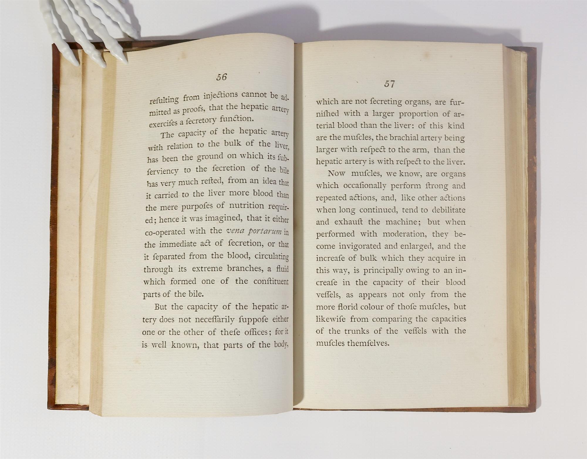 SAUNDERS, William. A Treatise on the Structure, Economy and Diseases of the Liver: Together with all Enquiry into Properties and Component Parts of the Bile and Biliary Concretions. Pub. LONDON: Sold by G. G. and J. Robinson, Pater-noster-row; J. Murray, Fleet Street; J. Johnson, St Pauls Church-yard; and T. Cox, St. Thomas's Street, Borough, 1793. First edition. 232pp. Saunders was a physician to Guy's Hospital and to the Prince Regent. In this book he was the first English physician to observe that some forms of cirrhosis of the liver, there was first enlargement and then contraction. Older rebinding with likely original leather boards and replaced spine. Occasional foxing in clean text. (205x128mm)