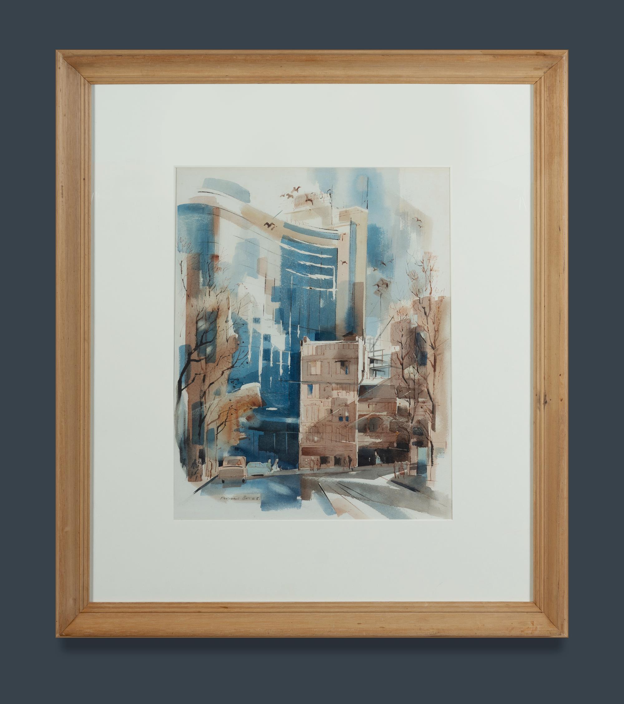 BATES, Frederic (1918-2009) Qantas House, Sydney, c.1950s. Signed lower left. W/Clr 47x38cm PROVENANCE: Davidson Auctions, December 7th 2022 (lot 120) OTHER NOTES: Qantas House was opened by the then Prime Minister Robert Menzies in October 1957.Estimate $200-400