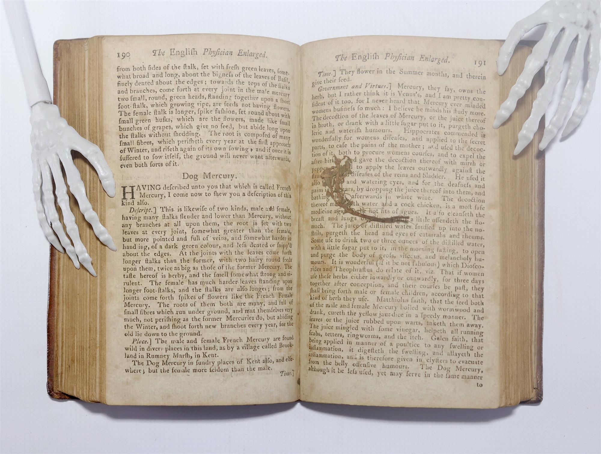CULPEPPER, Nicholas. The English Physician Enlarged with Three Hundred and Sixty-Nine Medicines, Made of English Herbs, that were not in any Impression Until This. Pub. LEEDS: Printed for John Binns; and sold by Vernor and Hood, Ogilvy and Son, and B. Crosby, London, 1799. Collation brief, Title, [5] leaves, 346pp., [1] leaf. Original full leather binding with some cracking to hinges, corners bumped and loss to the top of spine. Pastedowns with minor insect losses. Evenly foxed throughout and 3 pressed botanical insertions. Ink notation to 1 bottom margin. Labels to the pastedown: 'Presented by E. B. Gunson, M D., F.R.C.P., Chief Medical Officer, Northern Territory, 1950,' Edward Ford MD, K.F. Russell. Ink inscription from Gunson to ffep. (173x103mm)