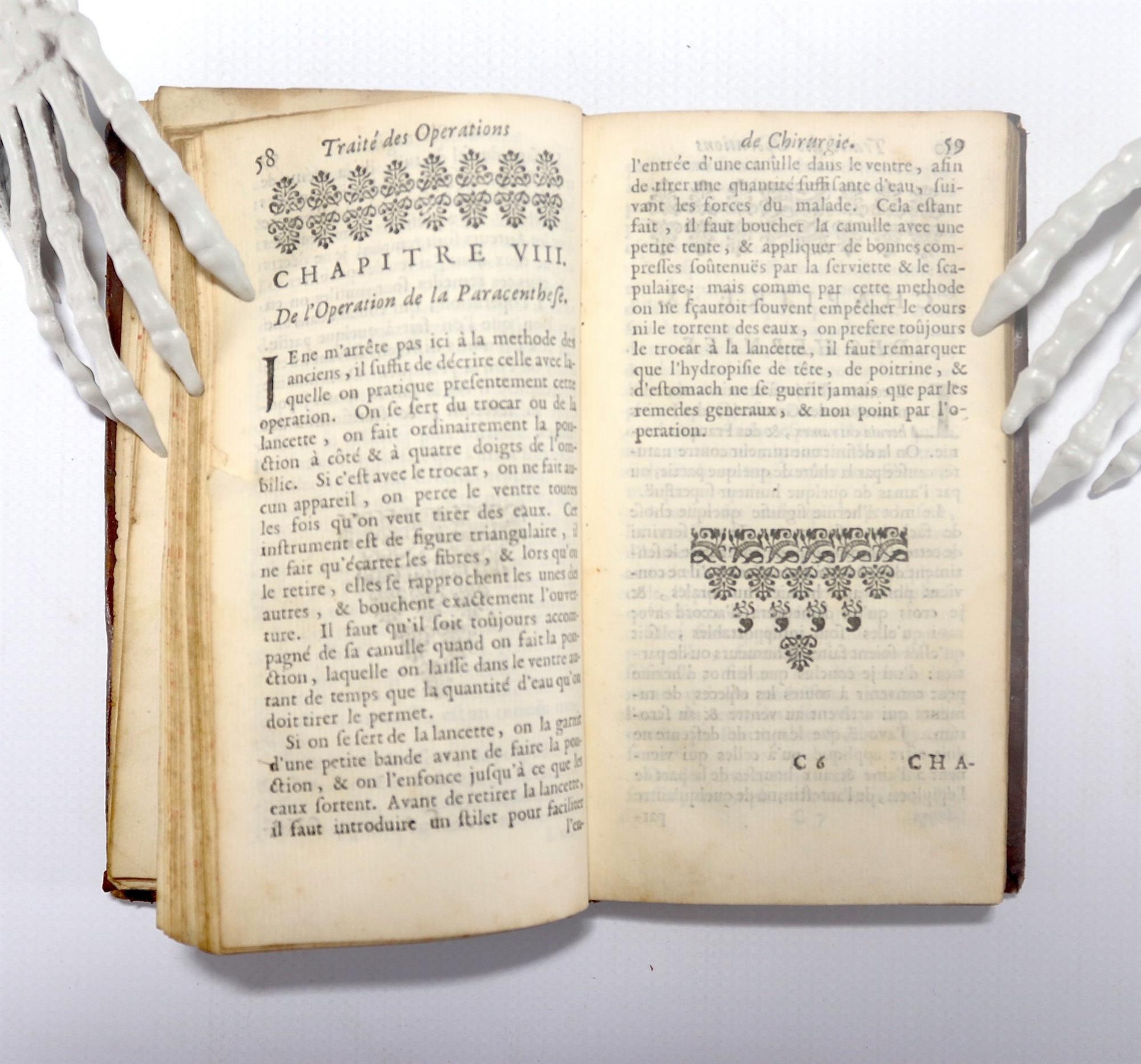CHARRIERE, Joseph de la. Nouvelles Operation de Chirurgie; Contenant leurs causes fondées sur la structure de la partie, leurs signes, leurs simptomes and leur explication; avce plusieurs Observations. Et une Ideégenerale des Playes. Pub. A PARIS: Chez Daniel Horthemels, MDCXCll (1692) Collation brief, Engraved title, title, [9] leaves, 331pp. A pocket surgical text. The author was a surgeon practising in Paris. Stamps of Cav, Giacomo Lantermino Parroco di Crissolo and D Giacomo Lantermino Mastro elementare Sanfront 1871 Full older leather binding with edge and corner wear, insect losses to spine. Text has some mild toning to the margins but generally very clean and straight. Refer to images. Book labels for Edward Ford and K.F. Russell. (130x73mm)