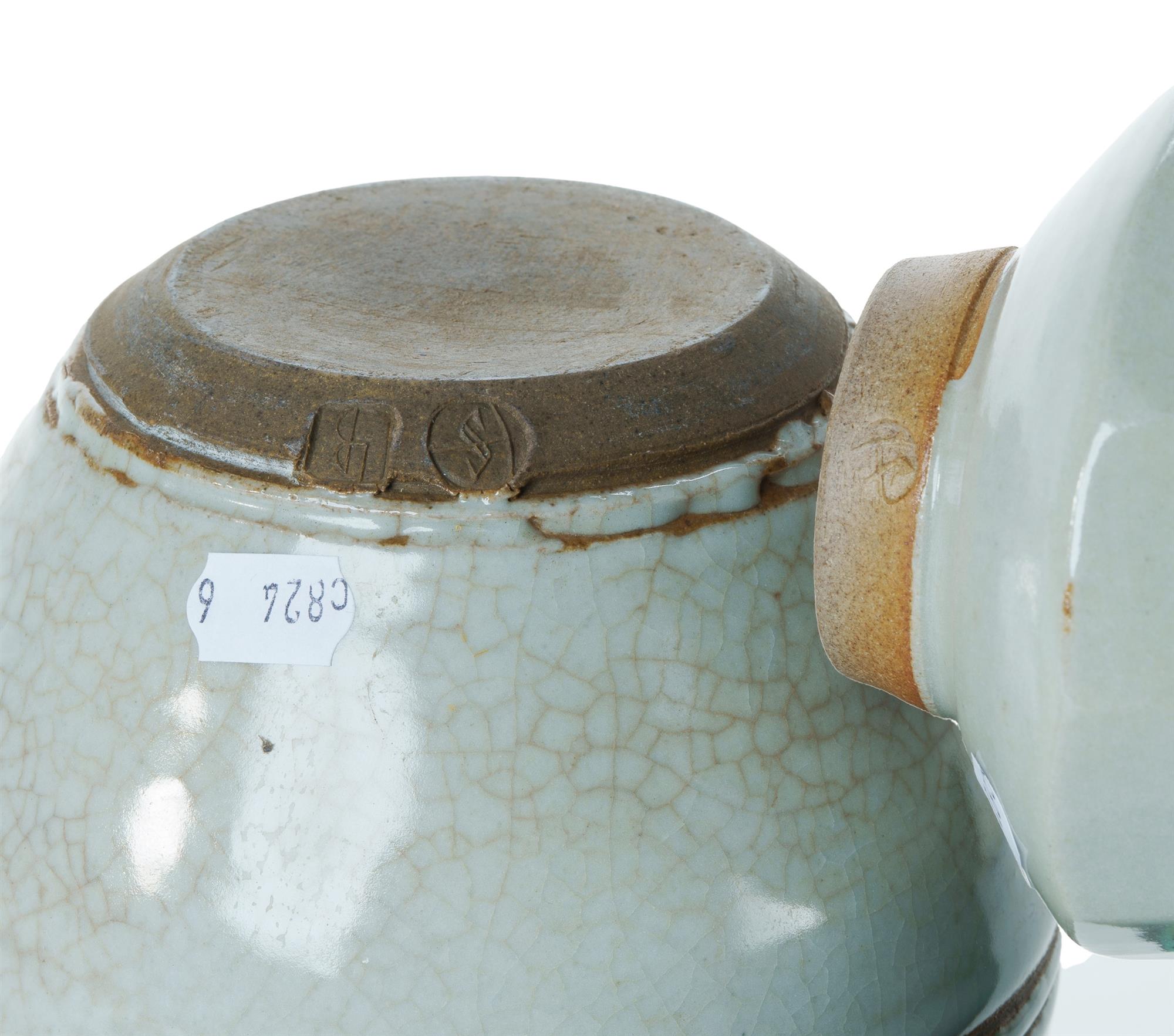 Les BLAKEBROUGH (1930-2022) Wine Carafe and Stopper Together with 3 raised foot cups. All with impressed studio mark to foot. H23cm (carafe) PROVENANCE: Harold Abbott collection; The Fred and Elinor Wrobel Collection, Sydney.Estimate $200-400