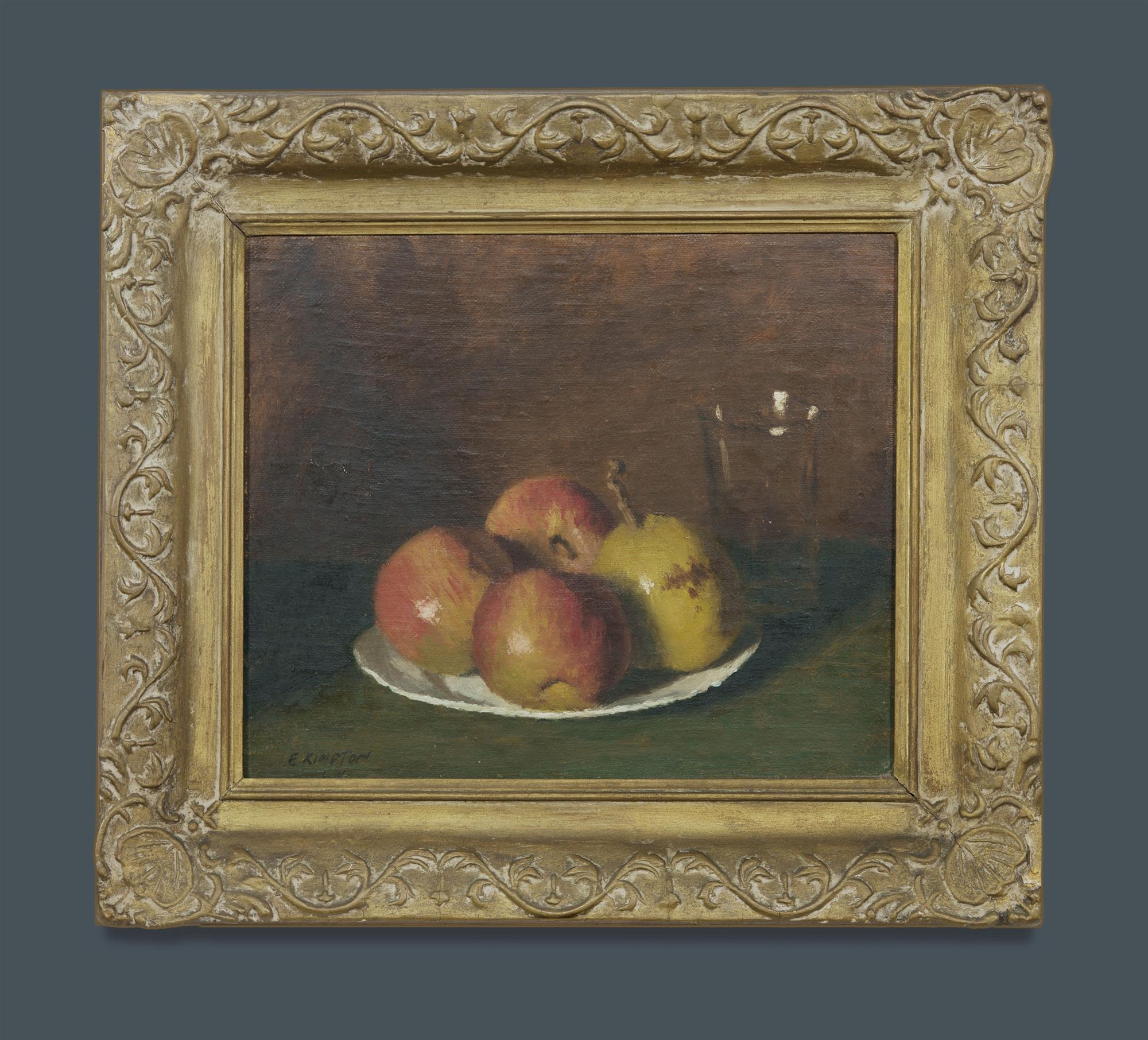 KIMPTON, Edward (Eddy) (1888-1965) Still Life with Apples and Pear, 1944. Signed and dated lower left. Labels verso for the Victorian Artists Society, and Barry's Art Gallery, Surfers Paradise, Qld. Oil on Canvas Board 25x30cm PROVENANCE: Davidson Auctions, 22nd March 2020 (lot 28); private collection, Sydney.Estimate $200-400