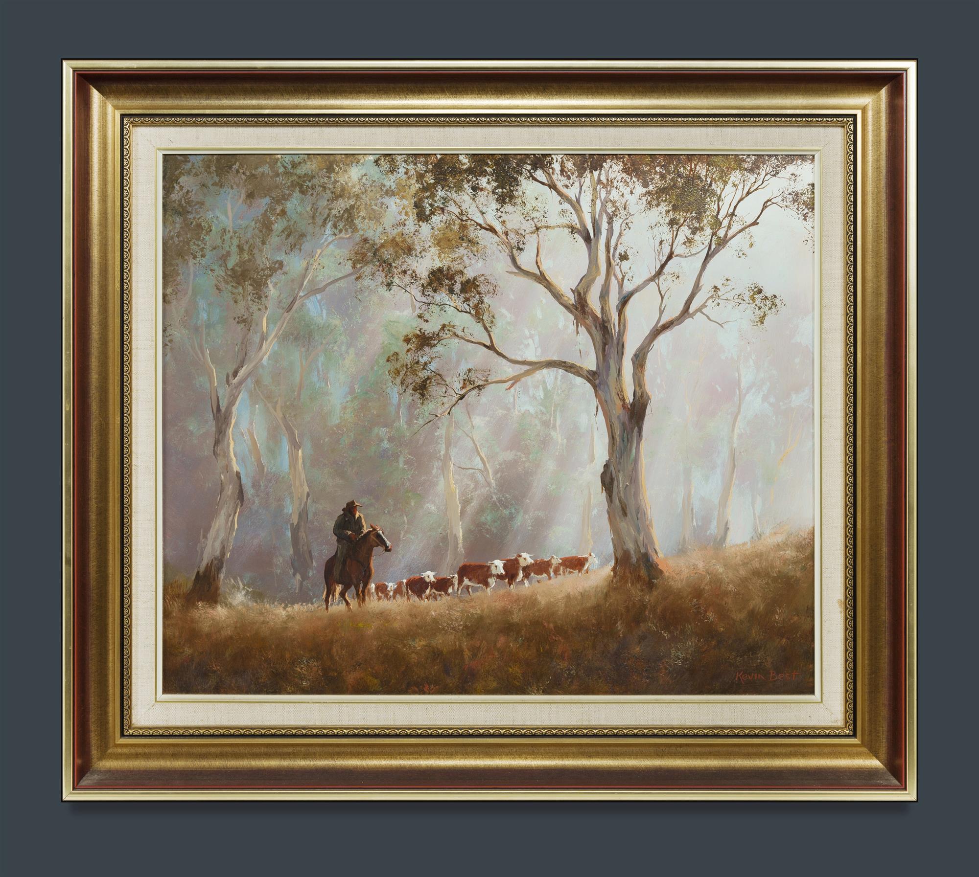 BEST, Kevin (1932-2012) 'Mustering in the High Country' Signed lower right. Oil on Board 49.5x59.5cmEstimate $1,200-2,500