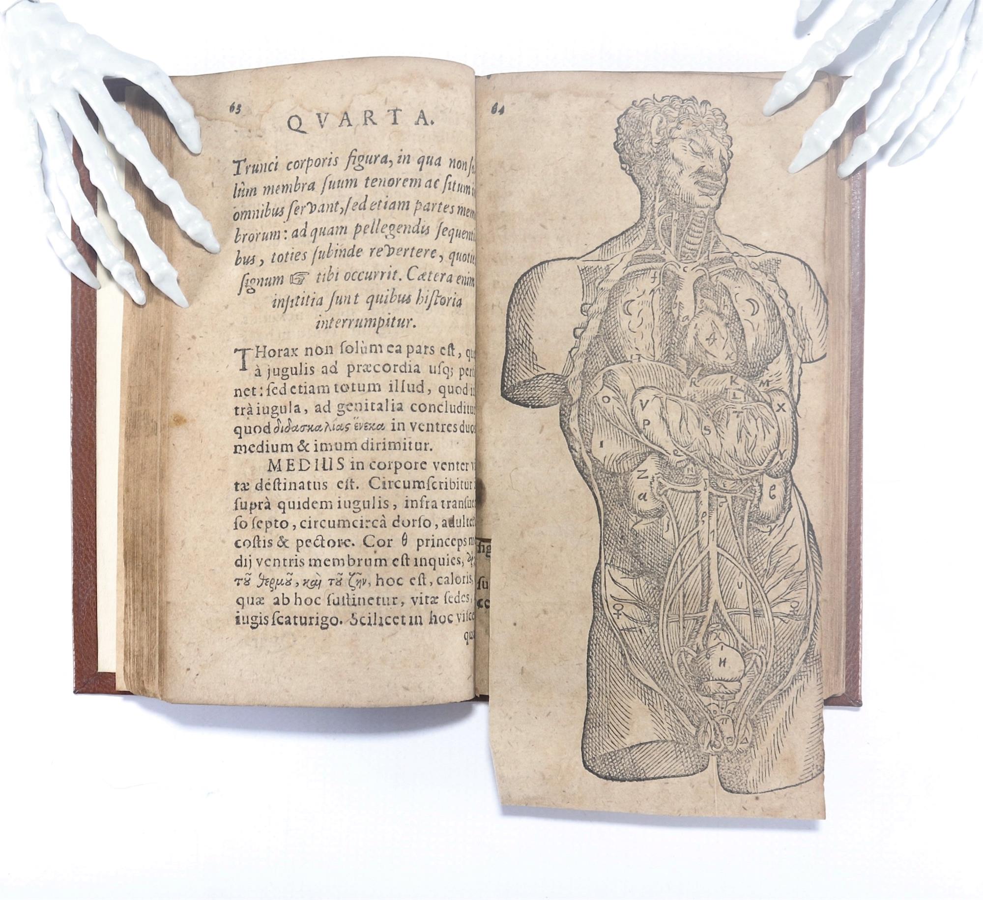 ALBERTI, Salomon. Historia Plærarum que Partium Humani Corporis, Membratim Scripta, and in usum tyronum retractior antehac edita. Pub. WITEBERGAE: Impensis Zachariæ Schureri & ejus Sociorum, 1602. Title, 7 leaves, 176 pp. Woodcuts throughout. Two, opposite D7v and E7v, tipped in and bottoms folded up, both included in page numbering. Alberti was professor at Wittemburg. His anatomy was first printed in 1583 and again in 1585. He clearly describes and illustrates the values of the veins and also the inclusion bones in the sutures of the skull usually named after Ole Worm (1588-1655). Later full tan leather binding has some staining and spine sunned. Toned text with some damp staining to the top margin. Overall unhandled and good. Refer to images. Bookplate: Ex Libris Anatomica K.F. Russell. (155x95mm)