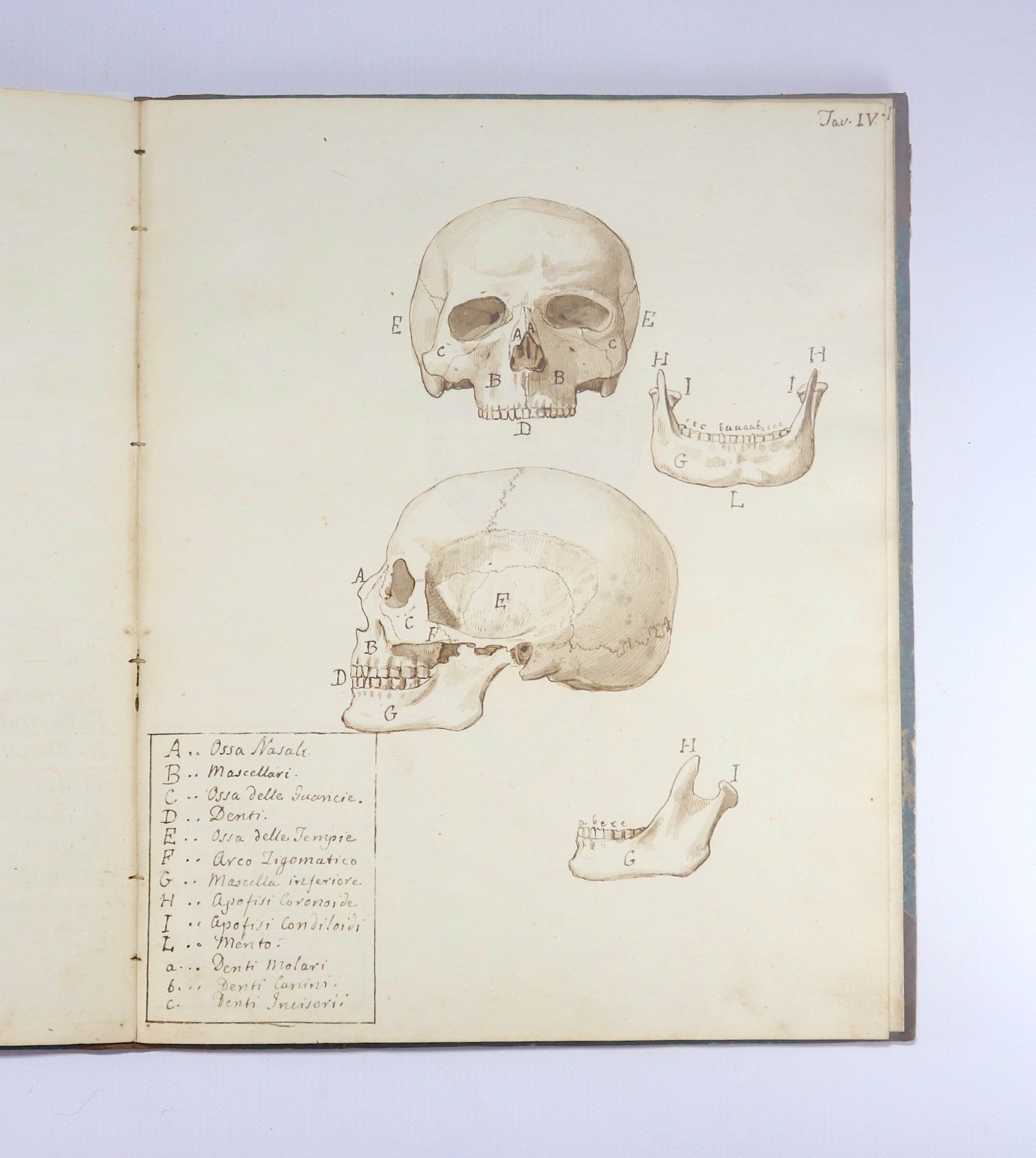Manuscript Osteology Album Manuscript in brown ink and wash of human osteology, likely late 18th C. There are 20 leaves of quality laid paper with skeletal sections drawn with a sure hand. Parts are lettered with a legend in Italian to each page. Author unknown. Signature of 'Babel, 1842' in pencil and impression of a seal in red wax on flyleaf. Original binding of half calf on flecked blue boards is aged and worn, surface losses to back. Plates are fairly clean and bright, overall very good. Bookplate: Ex Libris Anatomica K.F. Russell. (300x240mm)