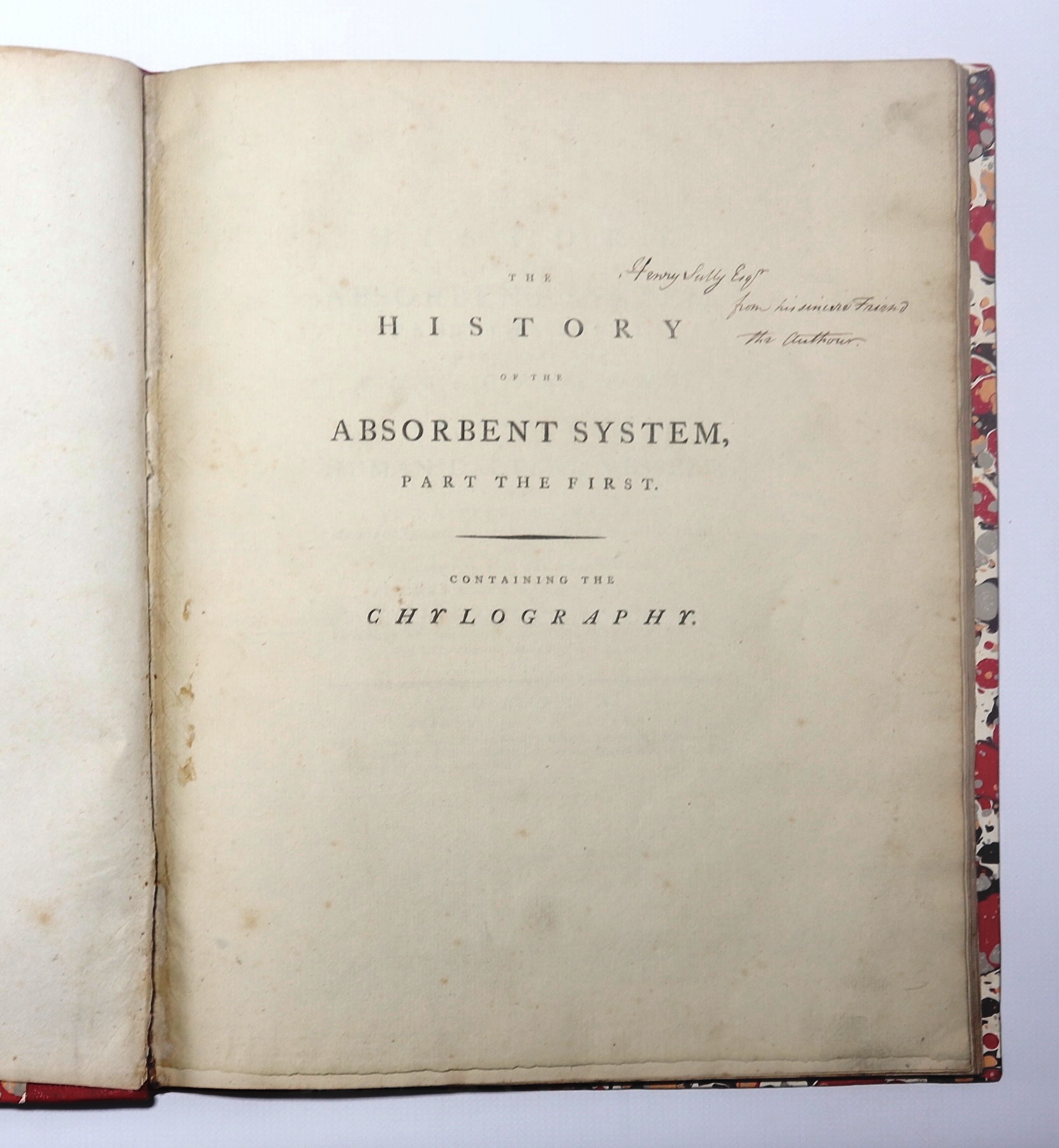 SHELDON, John. The History of the Absorbent System, part the First. Containing the chylography, or the description of the human lacteal vessels... Pub. LONDON: Printed for the author. 1784. Half-title, title, ppi-ii, 3 leaves (subscribers), 6 leaves :: 6 plates, ppi-ivi, 52pp, 1 leaf (errata) Russell British Anatomy 748 Only part first was published due to ill-health of the author. Russell British Anatomy 748. Presentation inscription "Henry Sully Esq from his sincere friend the author." Quarter red Morocco on marbled boards in good condition. A little soiling to the half title, the text, apart from darkening to page edges, is overall very good. Most plates are good, plate one soiled with repaired edge tear. Generally very presentable. (345x285mm)