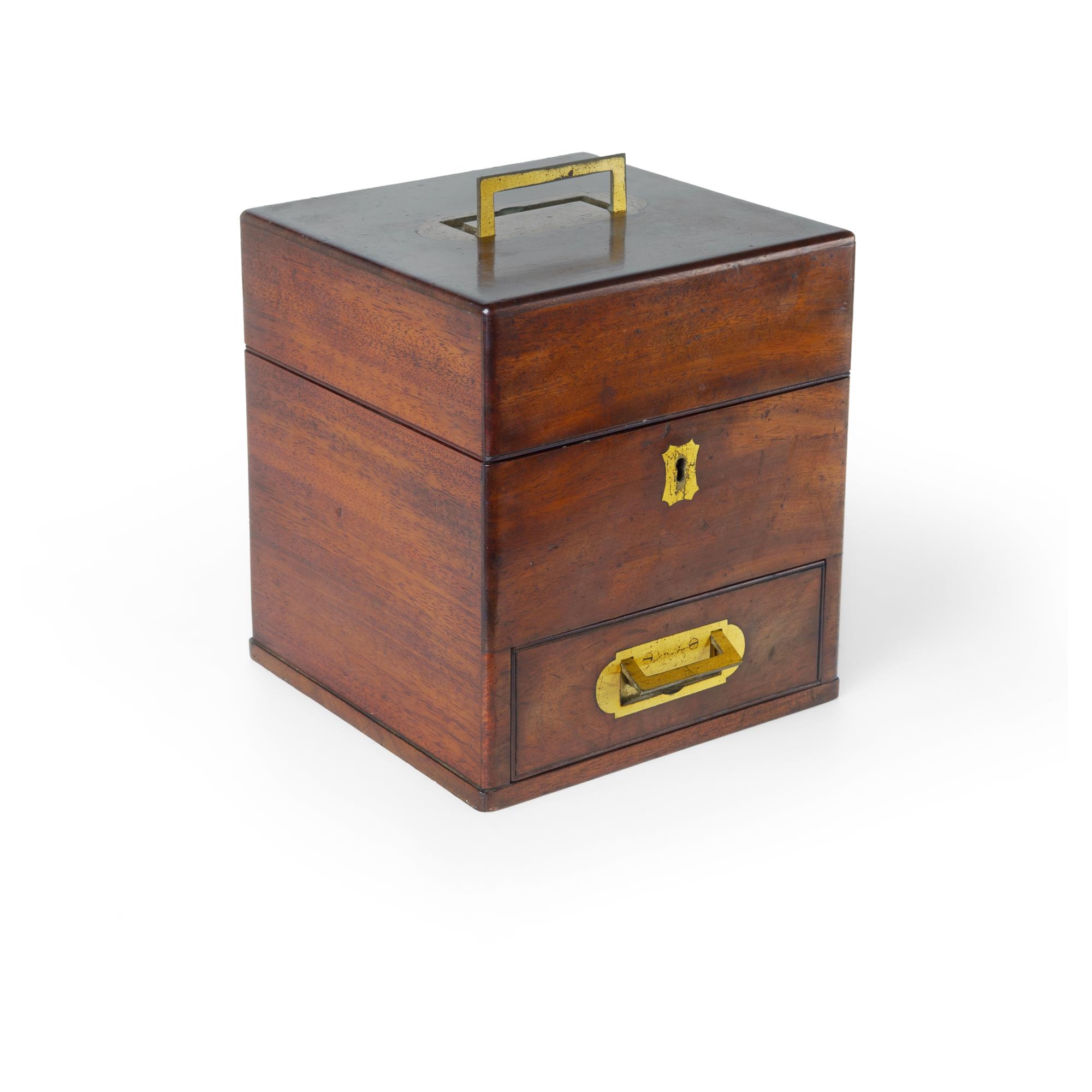 Small 19th C Travelling Apothecary / Medicine Chest Brass bound mahogany chest marked 'Thompson, London'. Containing 14 glass medicine bottles, scales, and mortar & pestle.