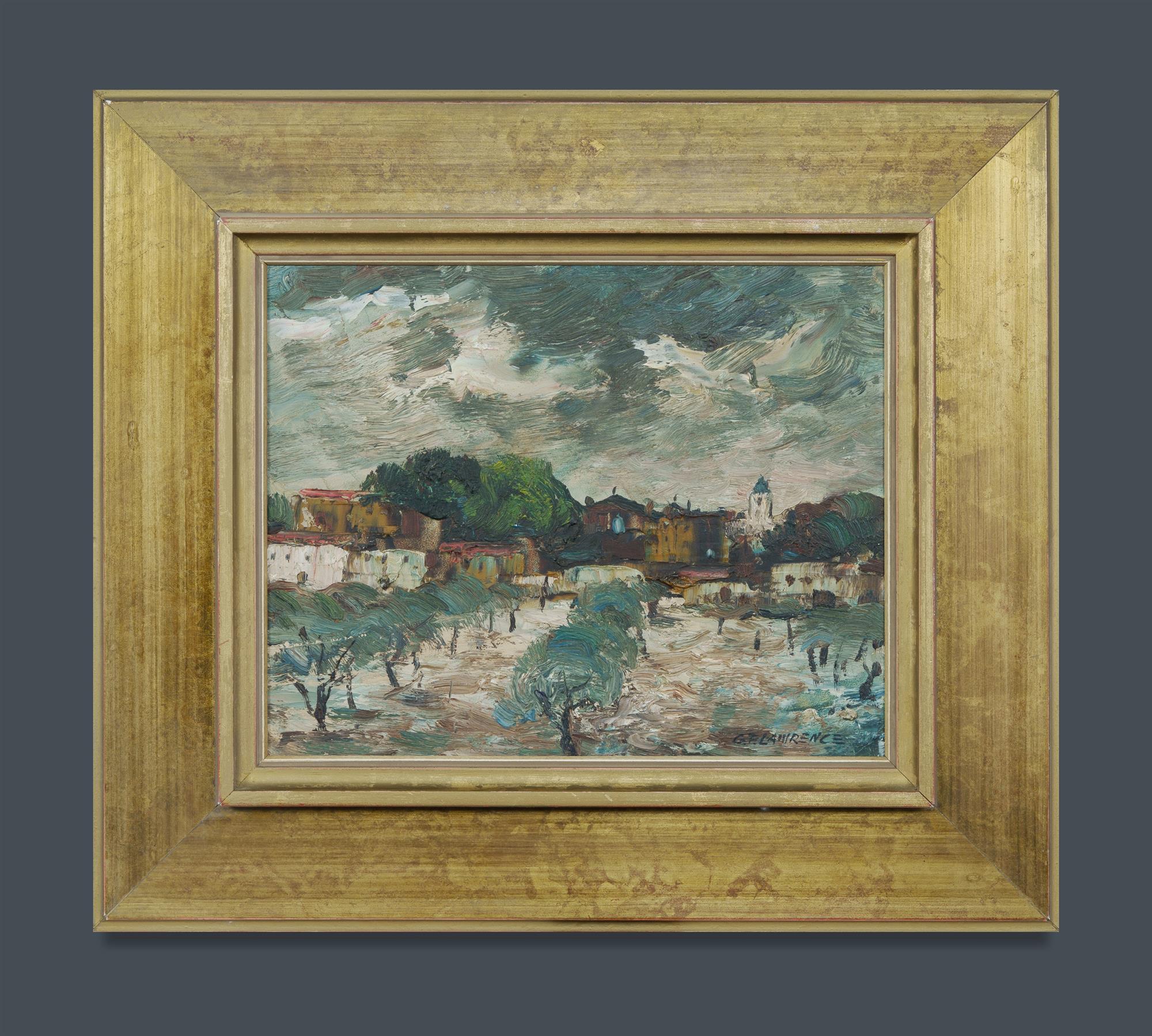 LAWRENCE, George Feather (1901-1981) 'Orange Grove (Portugal)' Signed lower right. Oil on Board 19.5x24.5cm PROVENANCE: The Schubert Galleries, Surfers Paradise, Qld (invoice supplied, dated 11th June 1988);The Estate of the Late Douglas Black, Queensland.Estimate $250-450