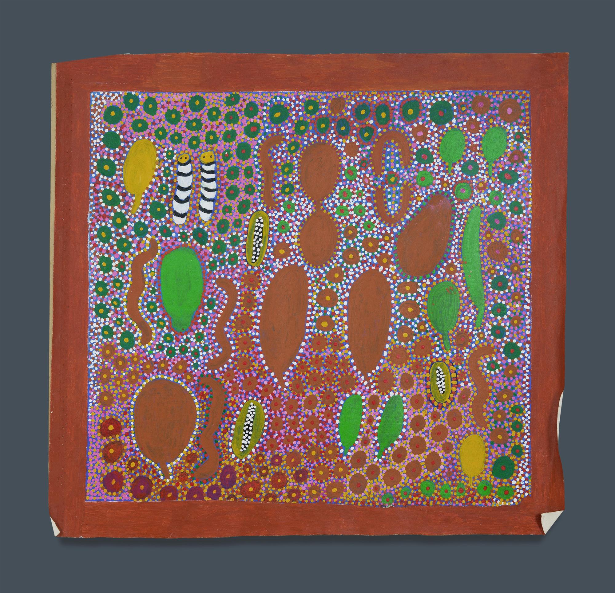 NAPURRULA, Janet Forrester (Aboriginal School Tennant Creek 'Bush Foods' Inscribed verso with artist's name. Acrylic on Canvas 57x52cm (image) PROVENANCE: Julalikari CDEP Arts and Crafts / Pink Palace (cat #JN722); Russell Guy, Didgeridoo / Artifacts, NT (certificate of authenticity supplied)Estimate $100-200