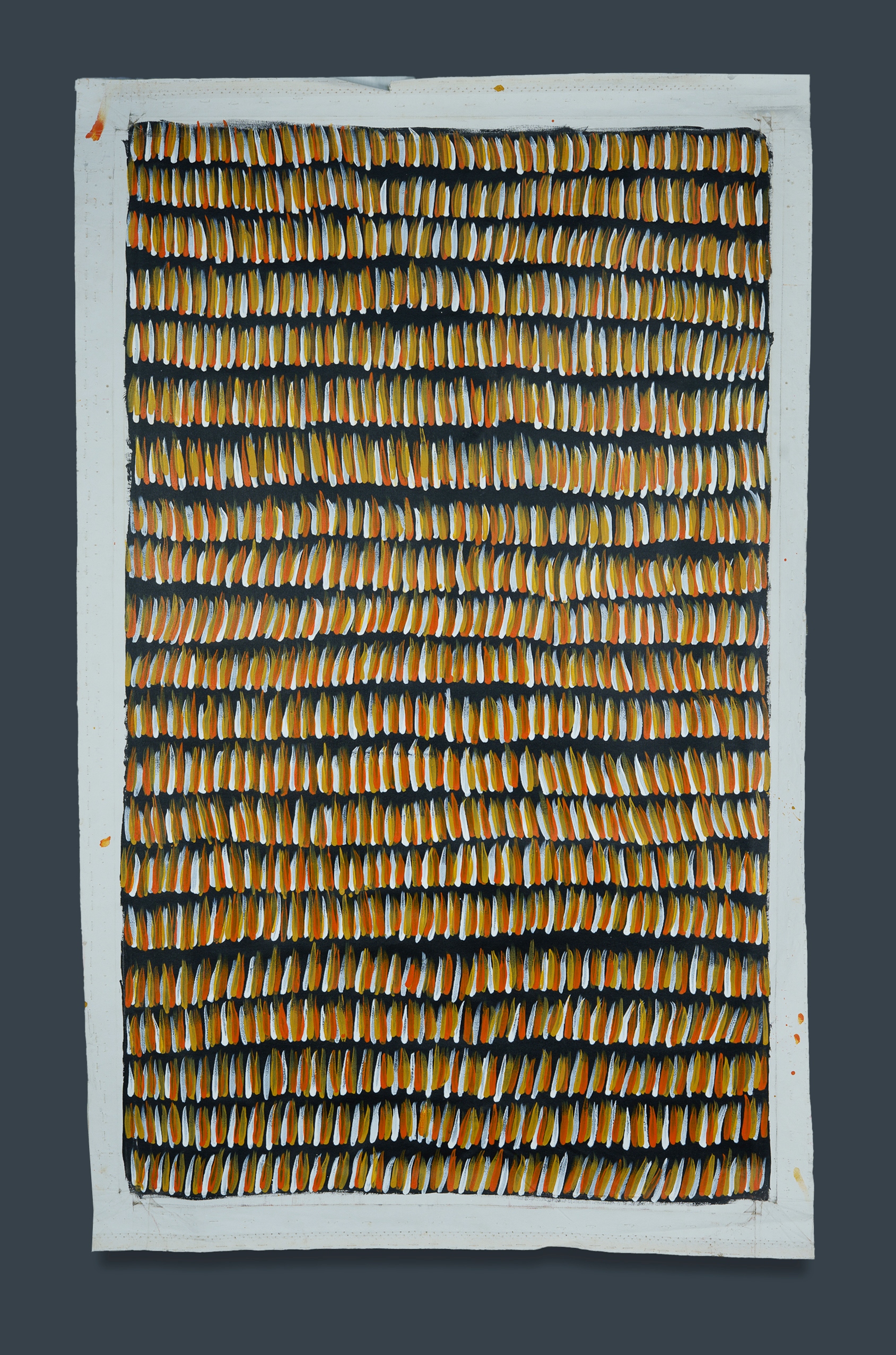 PETYARRE, Margaret Turner Price (Aboriginal 1950-2008) 'Bush Yam Seed,' 2004. Signed and inscribed verso: DBG/HBT TURM 04-0506. Acrylic on Canvas 145x87cm (image) PROVENANCE: Russell Guy, Didgeridoo / Artifacts, NT (certificate of authenticity supplied)Estimate $200-400