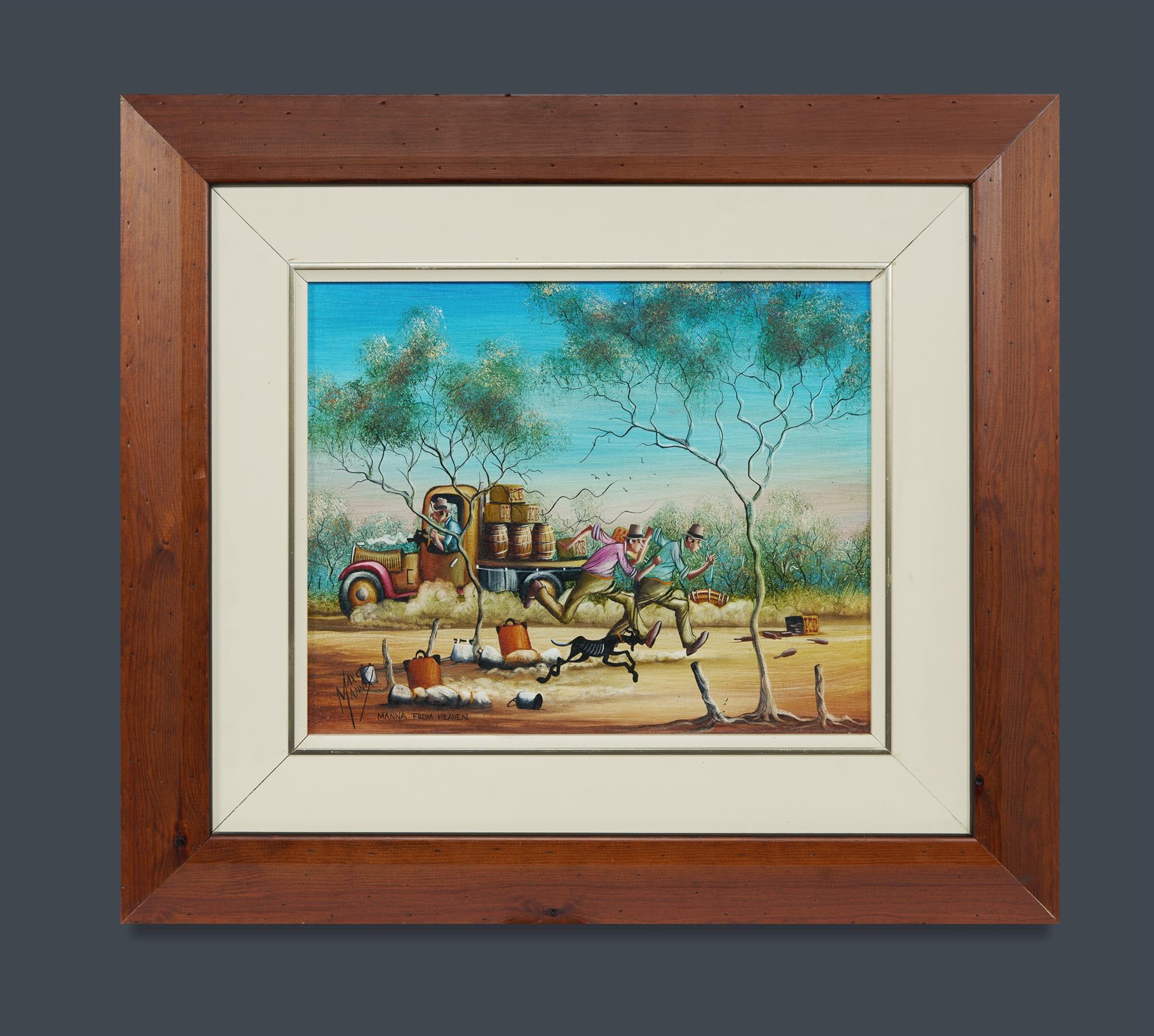 MANNIX, Max (b.1939) 'Manna From Heaven' Signed lower left. Additional signature, sketch and dedication verso. Oil on Canvas on Board 29x36cmEstimate $700-1,100