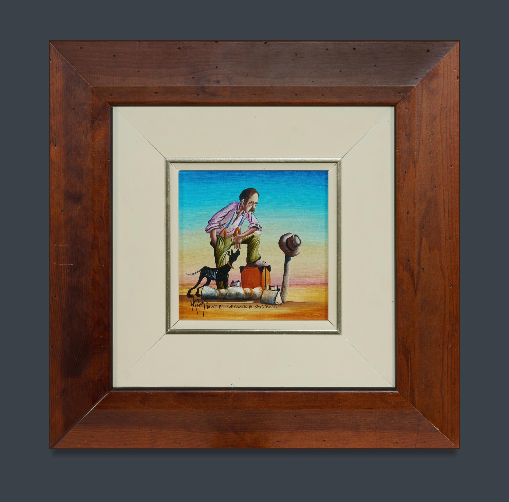MANNIX, Max (b.1939) 'Don't Believe A Word He Says Boss' Signed lower left. Additional signature, sketch and dedication verso. Oil on Canvas on Board 14x14cmEstimate $350-550