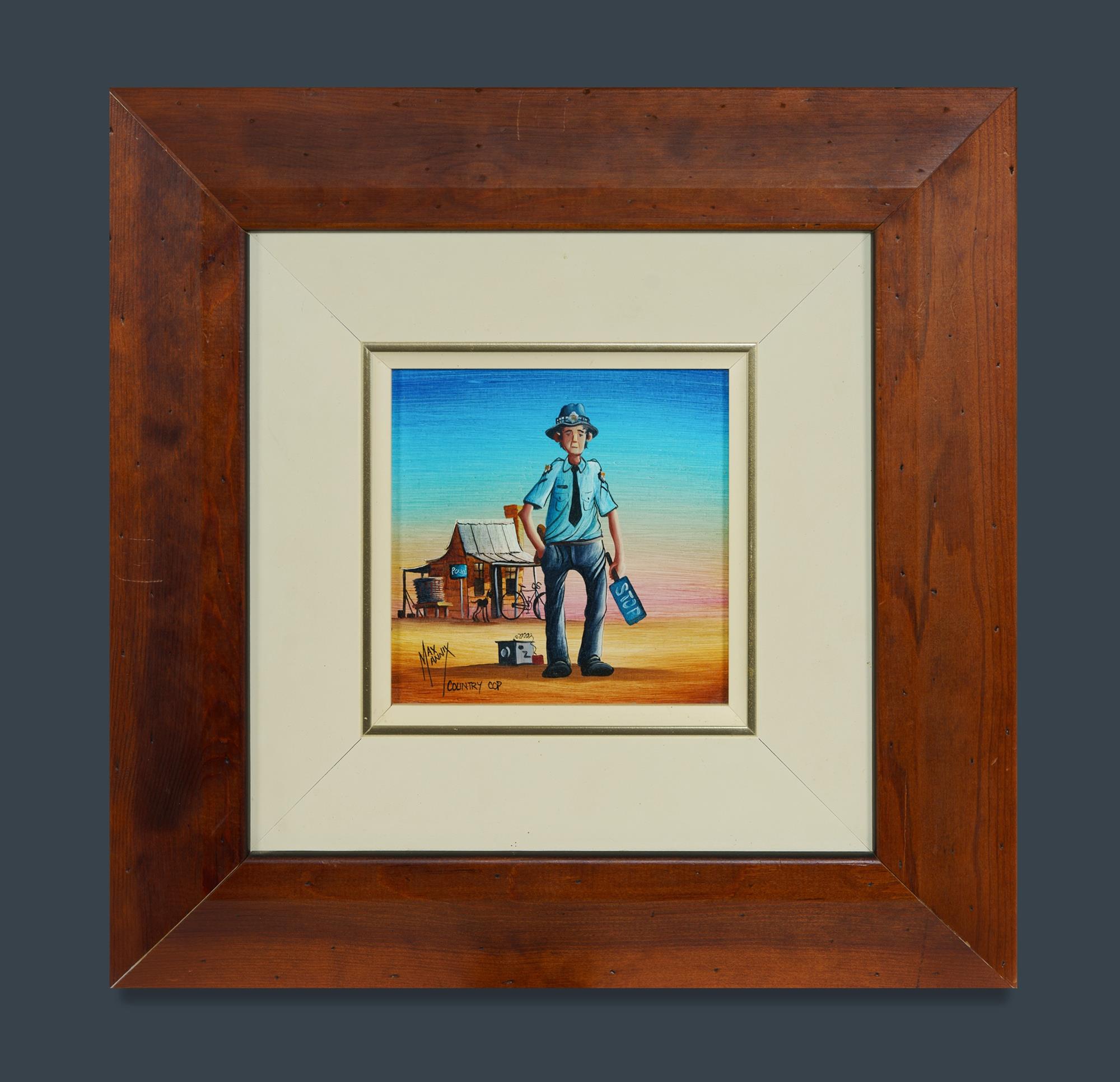MANNIX, Max (b.1939) 'Country Cop' Signed lower left. Oil on Canvas on Board 14x14cmEstimate $350-550