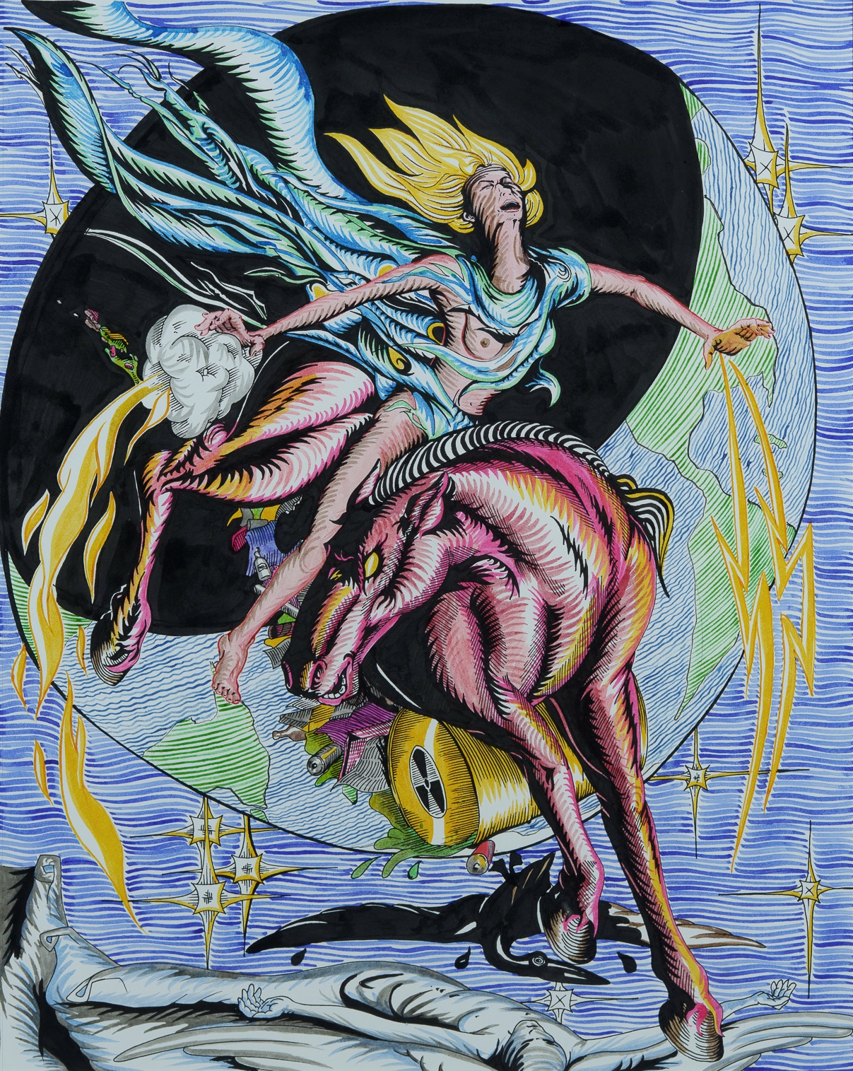 Artist Unknown, Signed 'Giles' (4) Four Horsemen of the Apocalypse - Conquest, War, Famine, Death. One work signed with monogram lower left. Coloured Permanent Marker Pens (4) 51.5x41cm (each)Estimate $400-600