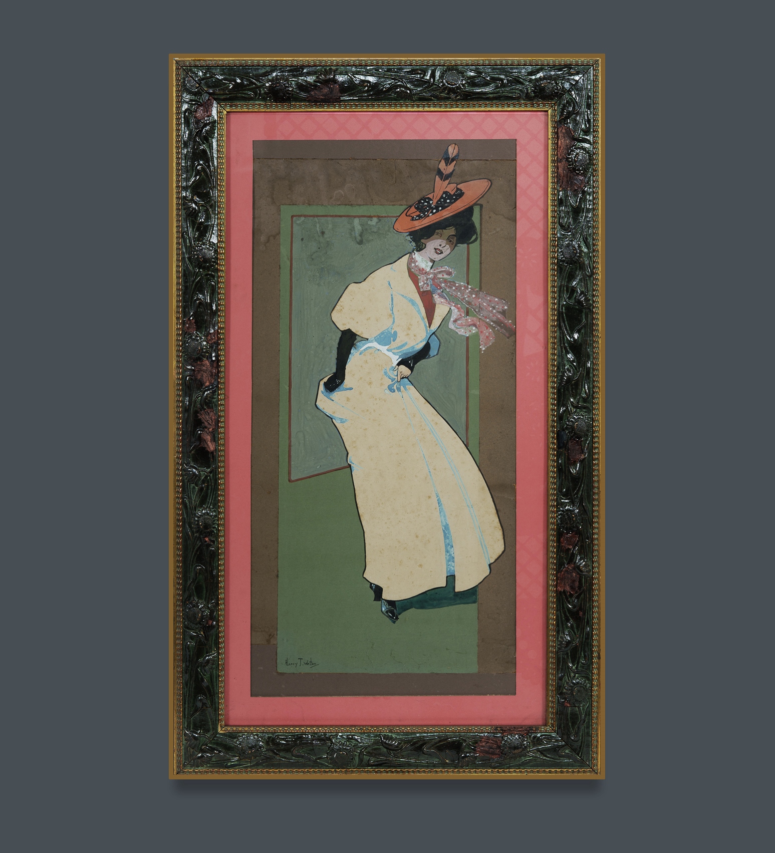 WESTON, Henry John (Harry) (1874-1938) Lady in White Dress and Red Hat, c.1910. Signed lower left. Gouache 64x30cm PROVENANCE: Keith Free Collection, Sydney.Estimate $180-350