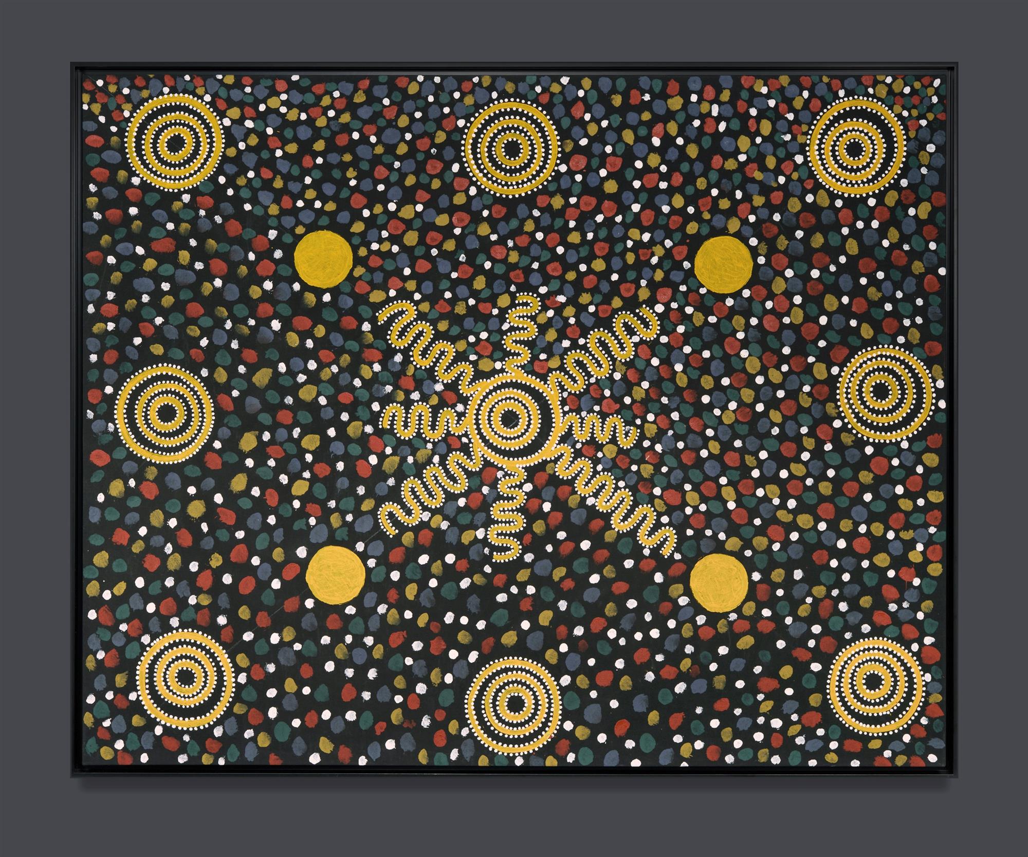 TJUNGURRAYI, Young Timothy Dempsey (Aboriginal c.1941) Untitled Signed verso and inscribed with cat #YTD ??-? (concealed by framing) Acrylic on Linen 151x121cm PROVENANCE: Ken Hinds Cultural Heritage Collection, Qld.Estimate $700-1,100