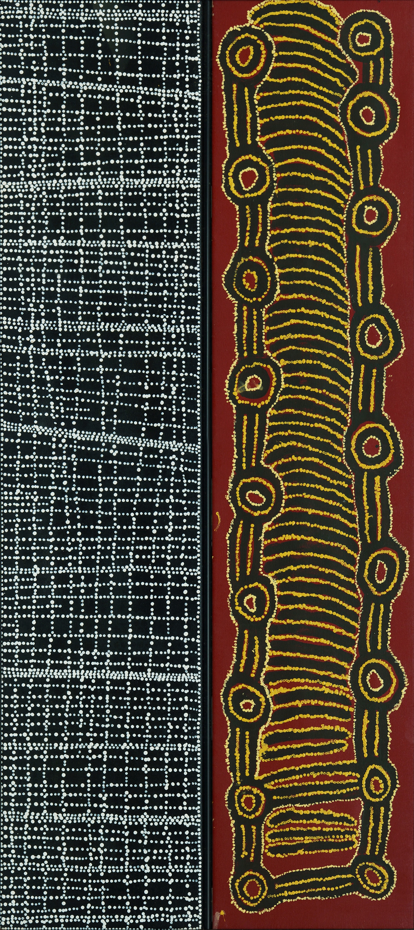 NAPANGARDI Dorothy (Aboriginal c.1956-2013) / TJAPANANGKA Paddy Lewis (Aboriginal 1928-2011) Untitled, 2003. Each work inscribed verso with artist's name and catalogue numbers (#DN200301 and #PADL200304) Acrylic on Linen (in 2 parts) 137x30cm (each panel) 146.5x70.5cm (overall frame)